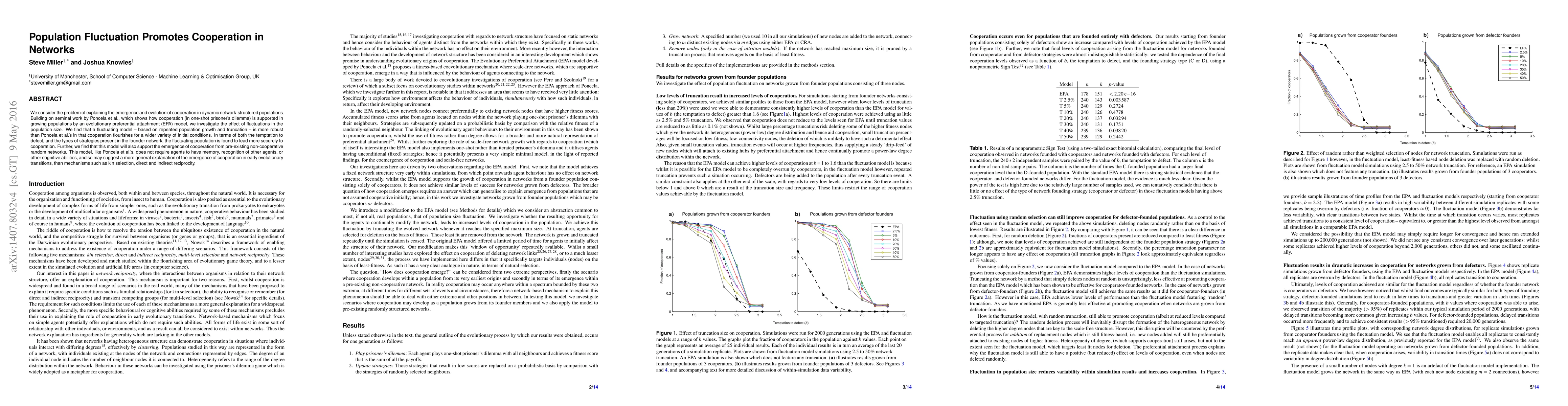 We consider the problem of explaining the emergence and evolution of cooperation in dynamic network-structured populations. Building on seminal work by Poncela et al, which shows how cooperation (in one-shot prisoner's dilemma) is supported in growing populations by an evolutionary preferential attachment (EPA) model, we investigate the effect of fluctuations in the population size. We find that the fluctuating model is more robust than Poncela et al's in that cooperation flourishes for a wide variety of initial conditions. In terms of both the temptation to defect, and the types of strategies present in the founder network, the fluctuating population is found to lead more securely to cooperation. Further, we find that this model will also support the emergence of cooperation from pre-existing non-cooperative random networks. This model, like Poncela et al's, does not require agents to have memory, recognition of other agents, or other cognitive abilities, and so may suggest a more general explanation of the emergence of cooperation in early evolutionary transitions, than mechanisms such as kin selection, direct and indirect reciprocity.