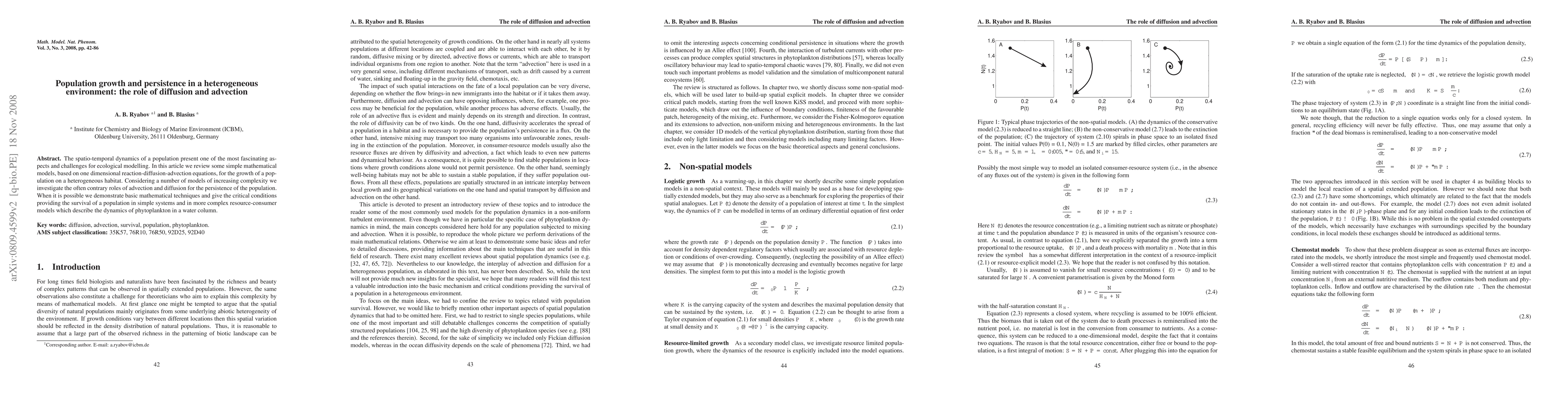 The spatio-temporal dynamics of a population present one of the most fascinating aspects and challenges for ecological modelling. In this article we review some simple mathematical models, based on one dimensional reaction-diffusion-advection equations, for the growth of a population on a heterogeneous habitat. Considering a number of models of increasing complexity we investigate the often contrary roles of advection and diffusion for the persistence of the population. When it is possible we demonstrate basic mathematical techniques and give the critical conditions providing the survival of a population, in simple systems and in more complex resource-consumer models which describe the dynamics of phytoplankton in a water column.