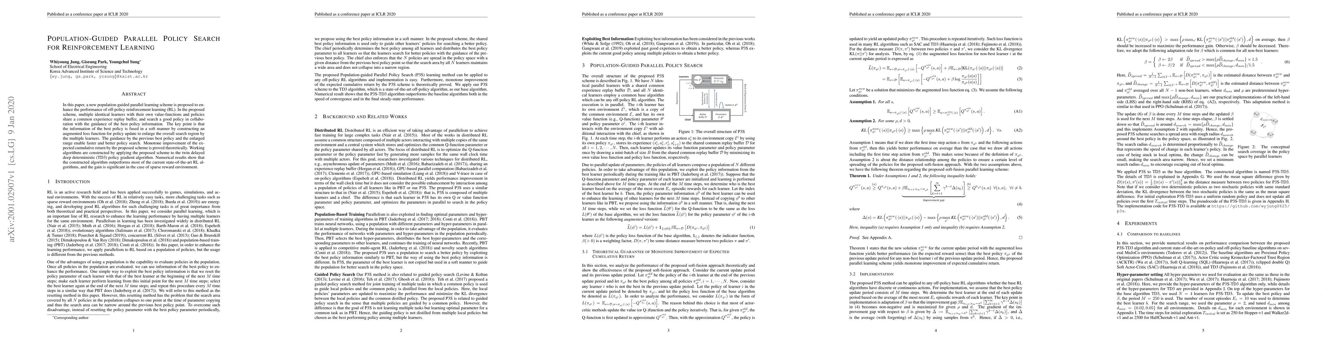 This paper introduces a population-guided parallel learning scheme to enhance off-policy reinforcement learning, where multiple learners collaboratively search for a better policy guided by the best policy information. The scheme uses an augmented loss function to incorporate the best policy's information, leading to faster and more effective policy search, with theoretical proof of monotone improvement in cumulative return.