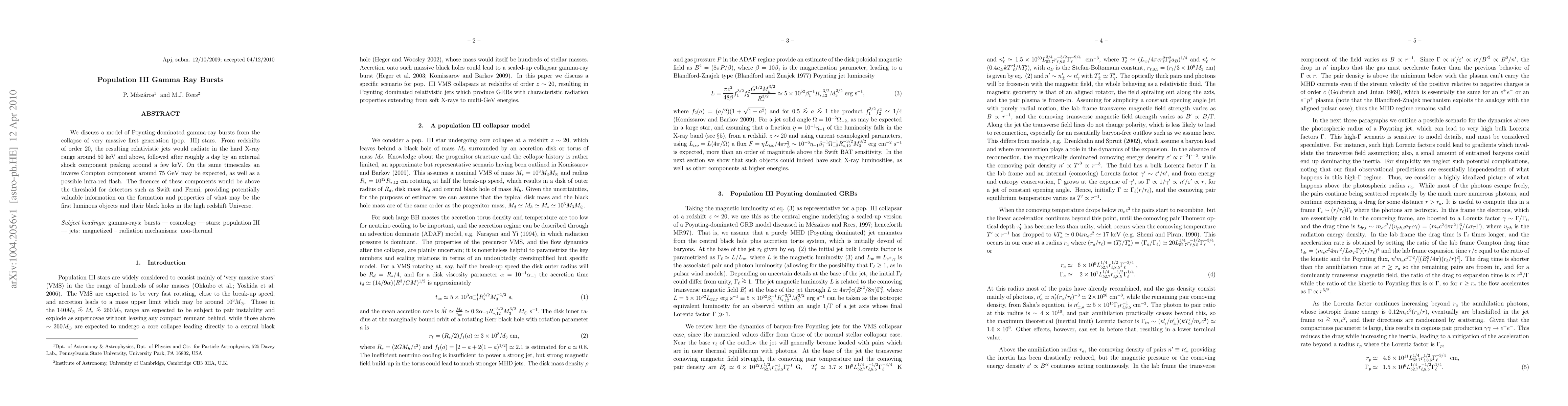 We discuss a model of Poynting-dominated gamma-ray bursts from the collapse of very massive first generation (pop. III) stars. From redshifts of order 20, the resulting relativistic jets would radiate in the hard X-ray range around 50 keV and above, followed after roughly a day by an external shock component peaking around a few keV. On the same timescales an inverse Compton component around 75 GeV may be expected, as well as a possible infra-red flash. The fluences of these components would be above the threshold for detectors such as Swift and Fermi, providing potentially valuable information on the formation and properties of what may be the first luminous objects and their black holes in the high redshift Universe.