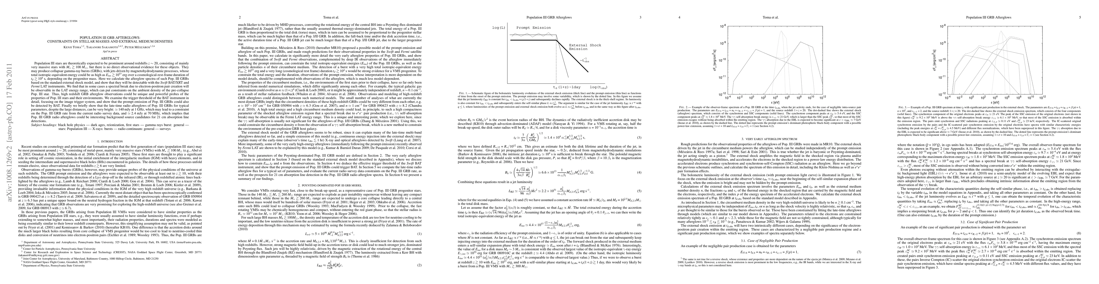 Population III stars are theoretically expected to be prominent around redshifts z ~ 20, consisting of mainly very massive stars with M_* >~ 10 M_sun$, but there is no direct observational evidence for these objects. They may produce collapsar gamma-ray bursts (GRBs), with jets driven by magnetohydrodynamic processes, whose total isotropic-equivalent energy could be as high as E_iso >~ 10^{57} erg over a cosmological-rest-frame duration of t_d >~ 10^4 s, depending on the progenitor mass. Here we calculate the afterglow spectra of such Pop. III GRBs based on the standard external shock model, and show that they will be detectable with the Swift BAT/XRT and Fermi LAT instruments. We find that in some cases a spectral break due to electron-positron pair creation will be observable in the LAT energy range, which can put constraints on the ambient density of the pre-collapse Pop. III star. Thus, high redshift GRB afterglow observations could be unique and powerful probes of the properties of Pop. III stars and their environments. We examine the trigger threshold of the BAT instrument in detail, focusing on the image trigger system, and show that the prompt emission of Pop. III GRBs could also be detected by BAT. Finally we briefly show that the late-time radio afterglows of Pop. III GRBs for typical parameters, despite the large distances, can be very bright: ~ 140 mJy at 1 GHz, which may lead to a constraint on the Pop. III GRB rate from the current radio survey data, and ~2.4 mJy at 70 MHz, which implies that Pop. III GRB radio afterglows could be interesting background source candidates for 21 cm absorption line detections.