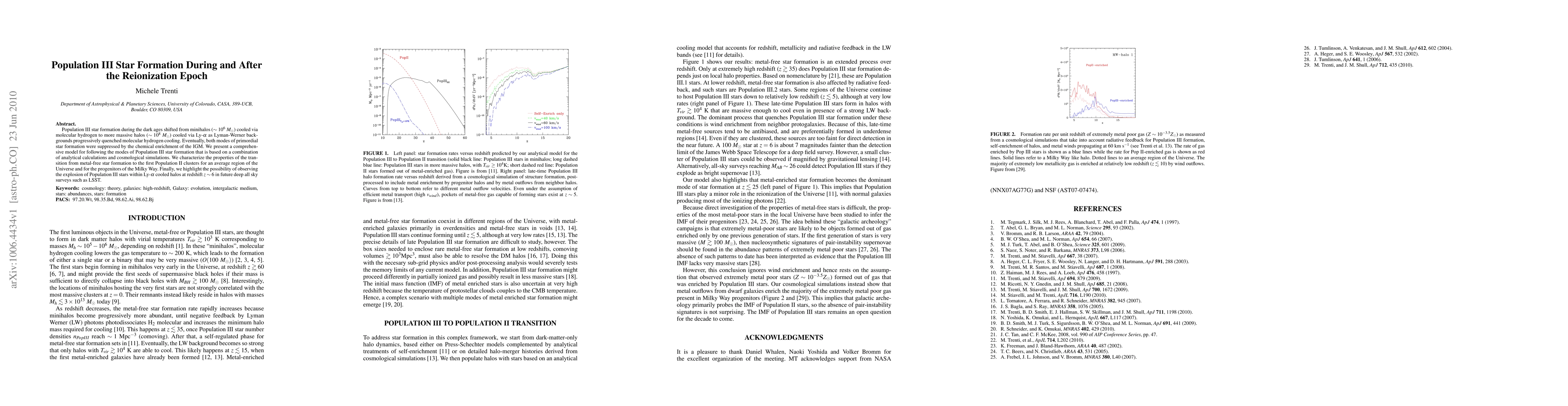 Population III star formation during the dark ages shifted from minihalos (~10^6 Msun) cooled via molecular hydrogen to more massive halos (~10^8 Msun) cooled via Ly-alpha as Lyman-Werner backgrounds progressively quenched molecular hydrogen cooling. Eventually, both modes of primordial star formation were suppressed by the chemical enrichment of the IGM. We present a comprehensive model for following the modes of Population III star formation that is based on a combination of analytical calculations and cosmological simulations. We characterize the properties of the transition from metal-free star formation to the first Population II clusters for an average region of the Universe and for the progenitors of the Milky Way. Finally, we highlight the possibility of observing the explosion of Population III stars within Ly-alpha cooled halos at redshift z~6 in future deep all sky surveys such as LSST.