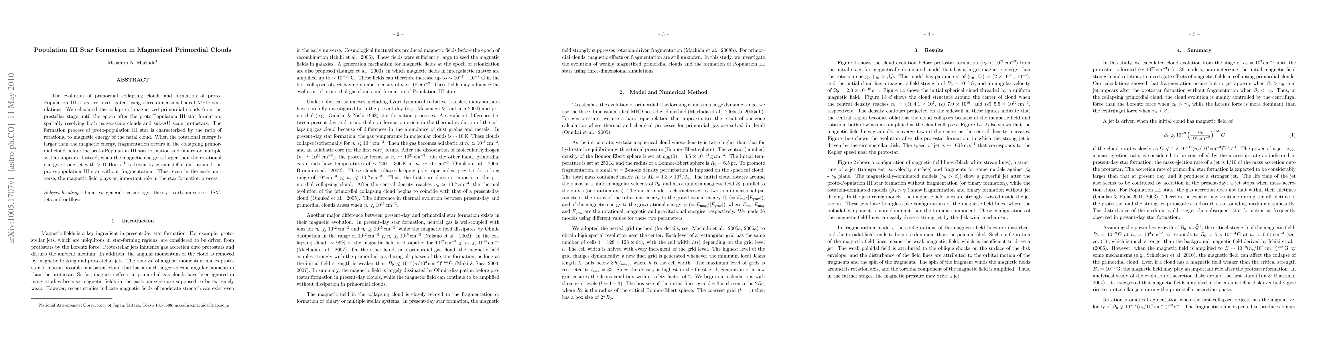 The evolution of primordial collapsing clouds and formation of proto-Population III stars are investigated using three-dimensional ideal MHD simulation. We calculated the evolution of magnetized primordial clouds from the prestellar stage until the epoch after the proto-Population III star formation, spatially resolving both parsec-scale clouds and sub-AU scale protostars. The formation process of proto-population III star is characterized by the ratio of rotational to magnetic energy of the parent cloud. When the rotational energy is larger than the magnetic energy, fragmentation occurs in the collapsing primordial cloud before the proto-Population III star formation and binary or multiple system appears. Instead, when the magnetic energy is larger than the rotational energy, strong jet with >100km s^-1 is driven by circumstellar disk around the proto-population III star without fragmentation. Thus, even in the early universe, the magnetic field plays an important role in the star formation process.
