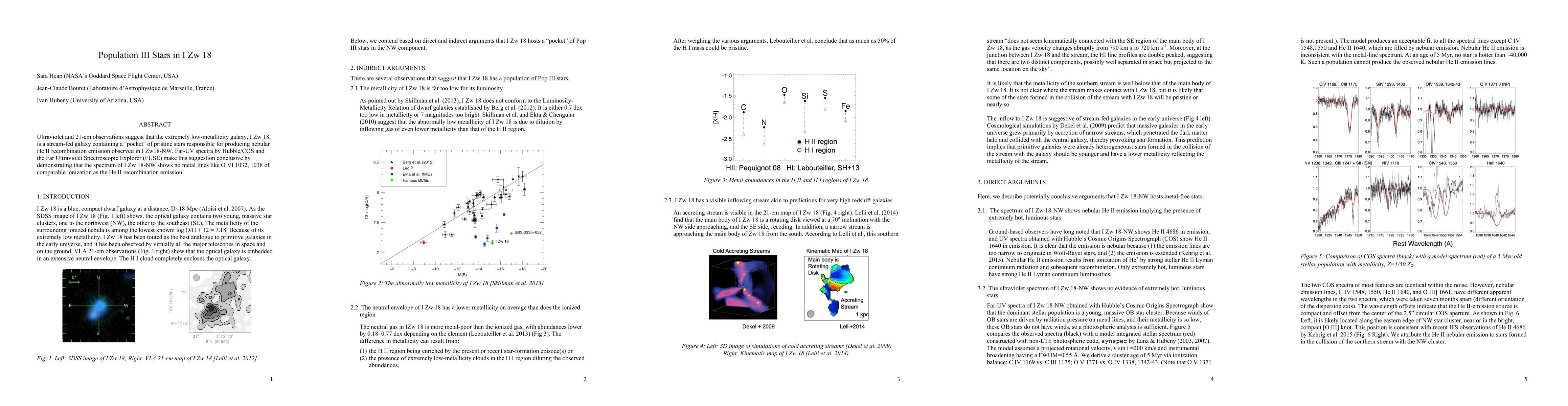 Ultraviolet and 21-cm observations suggest that the extremely low-metallicity galaxy, I Zw 18, is a stream-fed galaxy containing a "pocket" of pristine stars responsible for producing nebular He II recombination emission observed in I Zw18-NW. Far-UV spectra by Hubble/COS and the Far Ultraviolet Spectroscopic Explorer (FUSE) make this suggestion conclusive by demonstrating that the spectrum of I Zw 18-NW shows no metal lines like O VI 1032, 1038 of comparable ionization as the He II recombination emission.