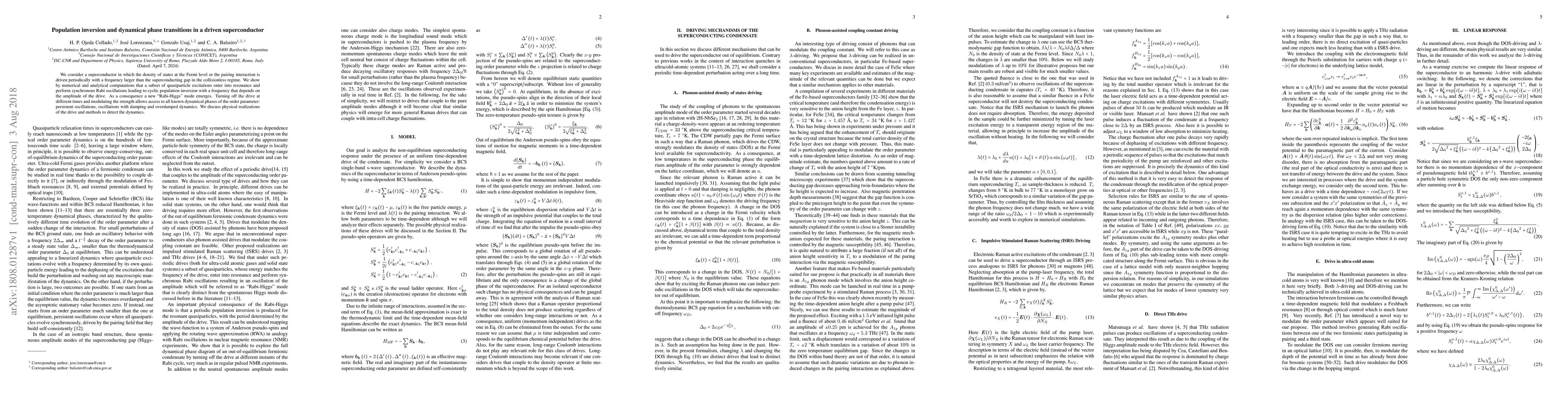We consider a superconductor in which the density of states at the Fermi level or the pairing interaction is driven periodically with a frequency larger than the superconducting gap in the collisionless regime. We show by numerical and analytical computations that a subset of quasiparticle excitations enter into resonance and perform synchronous Rabi oscillations leading to cyclic population inversion with a frequency that depends on the amplitude of the drive. As a consequence a new "Rabi-Higgs" mode emerges. Turning off the drive at different times and modulating the strength allows access to all known dynamical phases of the order parameter: persistent oscillations, oscillations with damping and overdamped dynamics. We discuss physical realizations of the drive and methods to detect the dynamics.