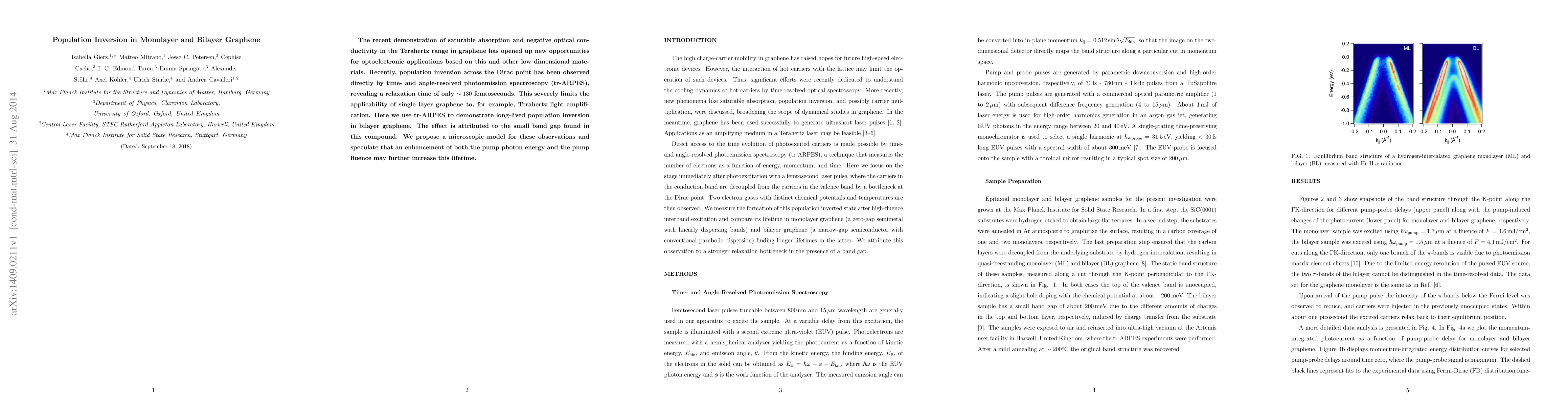 This paper demonstrates long-lived population inversion in bilayer graphene using time- and angle-resolved photoemission spectroscopy, attributing the effect to its small band gap. The study suggests that enhancing pump photon energy and fluence could further extend this inversion's lifetime, contrasting with the short relaxation time in monolayer graphene.