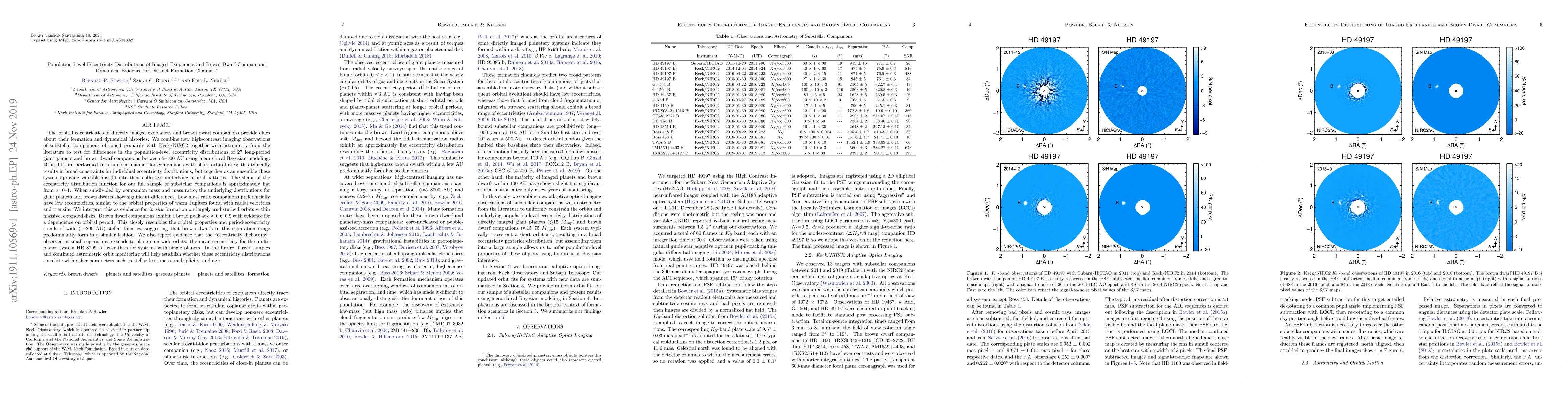 This study investigates the eccentricity distributions of directly imaged exoplanets and brown dwarf companions, revealing distinct formation channels. The findings suggest that low mass ratio companions formed in situ on low eccentricity orbits, while brown dwarf companions show a broad eccentricity peak, indicating formation mechanisms similar to wide stellar binaries.