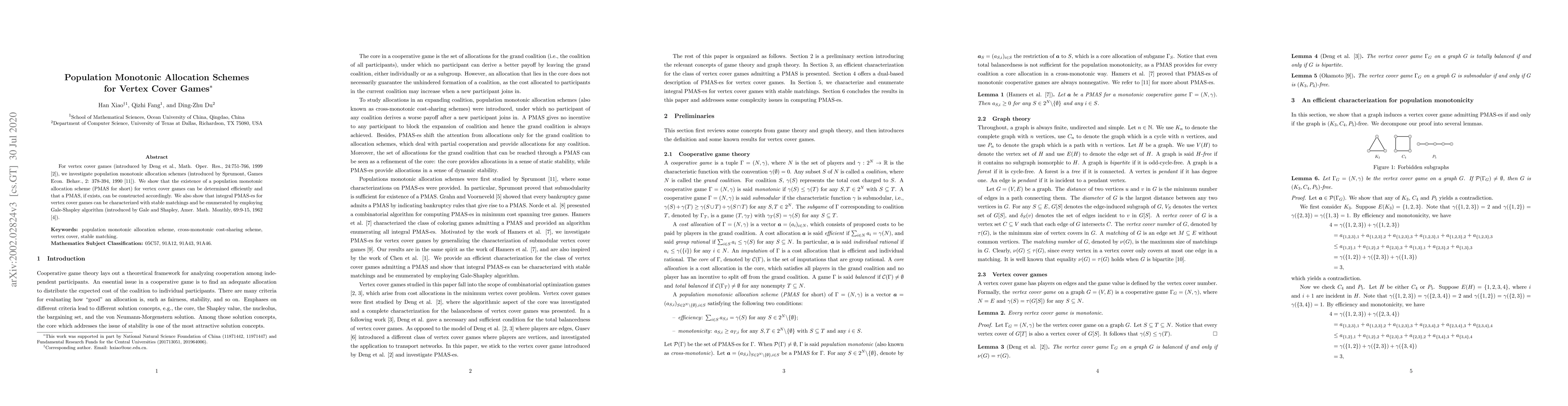 This paper explores population monotonic allocation schemes (PMAS) for vertex cover games, demonstrating efficient determination and construction of PMAS. It also characterizes integral PMAS using stable matchings and enumerates them via the Gale-Shapley algorithm.