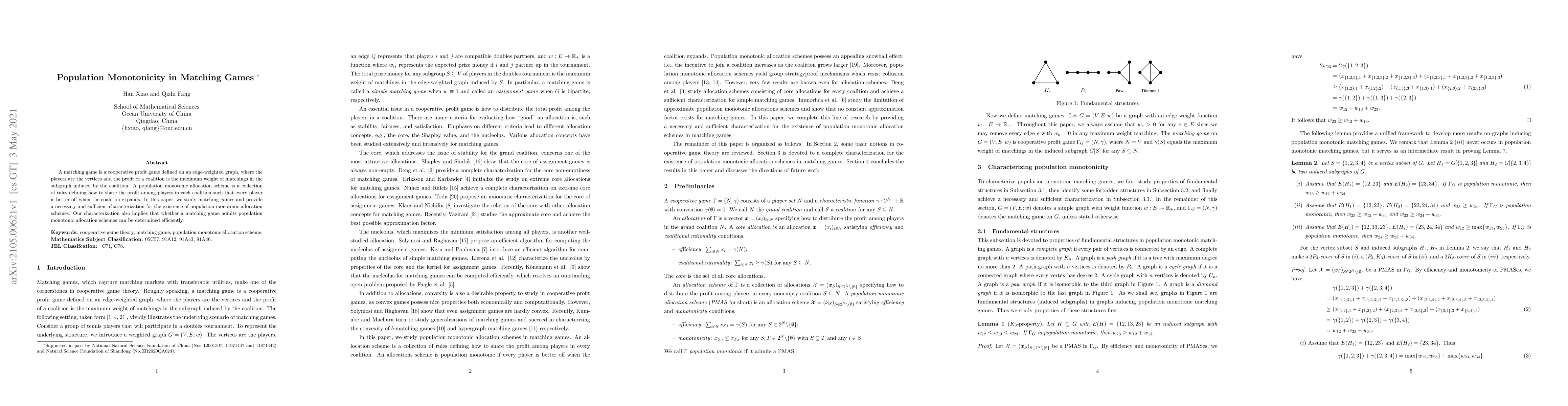 This paper characterizes the existence of population monotonic allocation schemes in matching games, showing that such schemes exist if and only if certain graph-theoretic conditions are met. It also demonstrates that determining the existence of these schemes can be done efficiently.