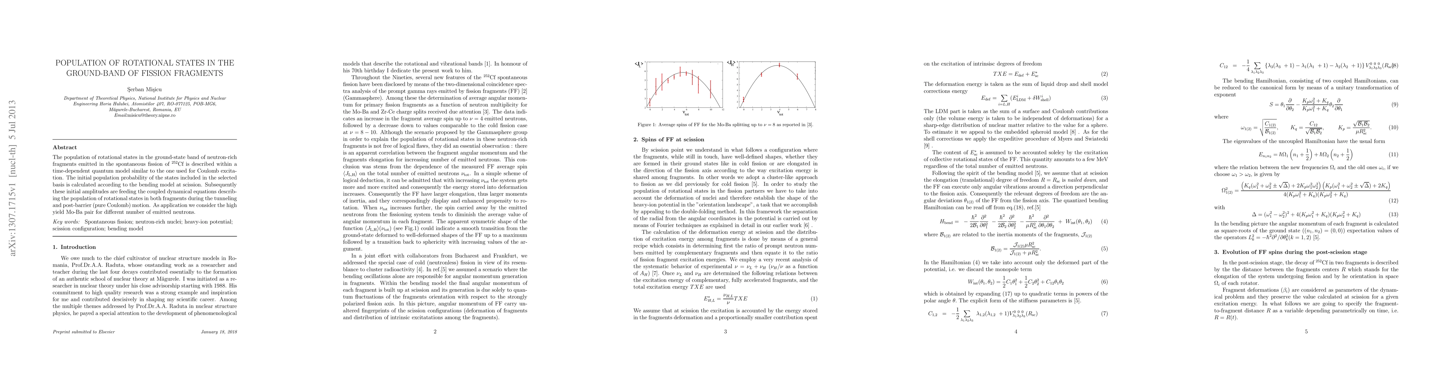 The population of rotational states in the ground-state band of neutron-rich fragments emitted in the spontaneous fission of $^{252}$Cf is described within a time-dependent quantum model similar to the one used for Coulomb excitation. The initial population probability of the states included in the selected basis is calculated according to the bending model at scission. Subsequently these initial amplitudes are feeding the coupled dynamical equations describing the population of rotational states in both fragments during the tunneling and post-barrier (pure Coulomb) motion. As application we consider the high yield Mo-Ba pair for different number of emitted neutrons.
