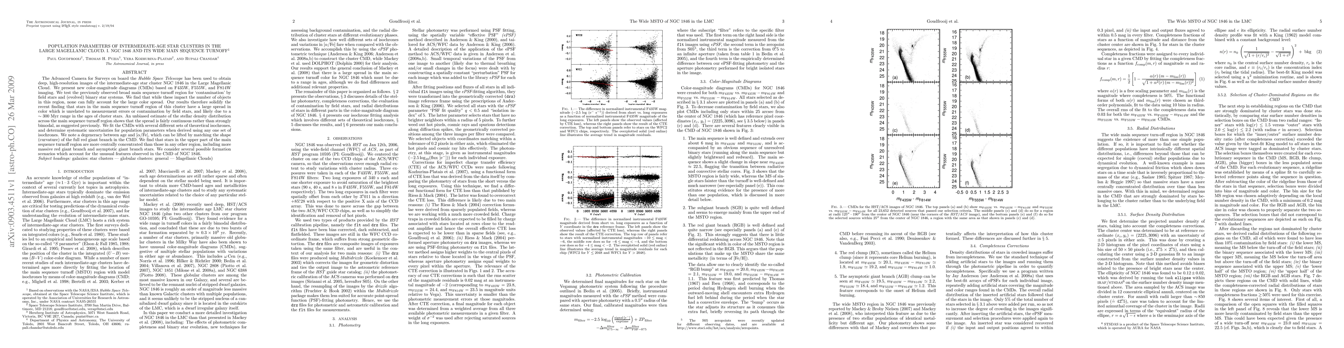 The Advanced Camera for Surveys on board the Hubble Space Telescope has been used to obtain deep, high-resolution images of the intermediate-age star cluster NGC 1846 in the Large Magellanic Cloud. We present new color-magnitude diagrams (CMDs) based on F435W, F555W, and F814W imaging. We test the previously observed broad main sequence turnoff region for "contamination" by field stars and (evolved) binary star systems. We find that while these impact the number of objects in this region, none can fully account for the large color spread. Our results therefore solidify the recent finding that stars in the main sequence turnoff region of this cluster have a large spread in color which is unrelated to measurement errors or contamination by field stars, and likely due to a ~300 Myr range in the ages of cluster stars. An unbiased estimate of the stellar density distribution across the main sequence turnoff region shows that the spread is fairly continuous rather than strongly bimodal as suggested previously. We fit the CMDs with several different sets of theoretical isochrones, and determine systematic uncertainties for population parameters when derived using any one set of isochrones. We note a degeneracy between age and [alpha/Fe], which can be lifted by matching the shape (curvature) of the full red giant branch in the CMD. We find that stars in the upper part of the main sequence turnoff region are more centrally concentrated than those in any other region of the CMD, including more massive red giant branch and asymptotic giant branch stars. We consider several possible formation scenarios which account for the unusual features observed in the CMD of NGC 1846.