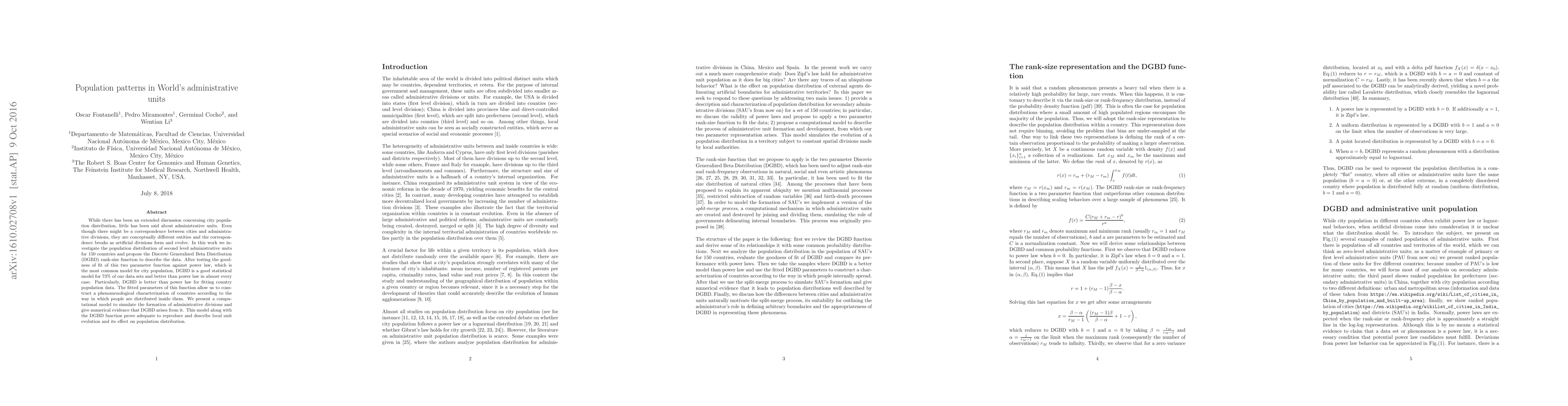 While there has been an extended discussion concerning city population distribution, little has been said about administrative units. Even though there might be a correspondence between cities and administrative divisions, they are conceptually different entities and the correspondence breaks as artificial divisions form and evolve. In this work we investigate the population distribution of second level administrative units for 150 countries and propose the Discrete Generalized Beta Distribution (DGBD) rank-size function to describe the data. After testing the goodness of fit of this two parameter function against power law, which is the most common model for city population, DGBD is a good statistical model for 73% of our data sets and better than power law in almost every case. Particularly, DGBD is better than power law for fitting country population data. The fitted parameters of this function allow us to construct a phenomenological characterization of countries according to the way in which people are distributed inside them. We present a computational model to simulate the formation of administrative divisions and give numerical evidence that DGBD arises from it. This model along with the DGBD function prove adequate to reproduce and describe local unit evolution and its effect on population distribution.