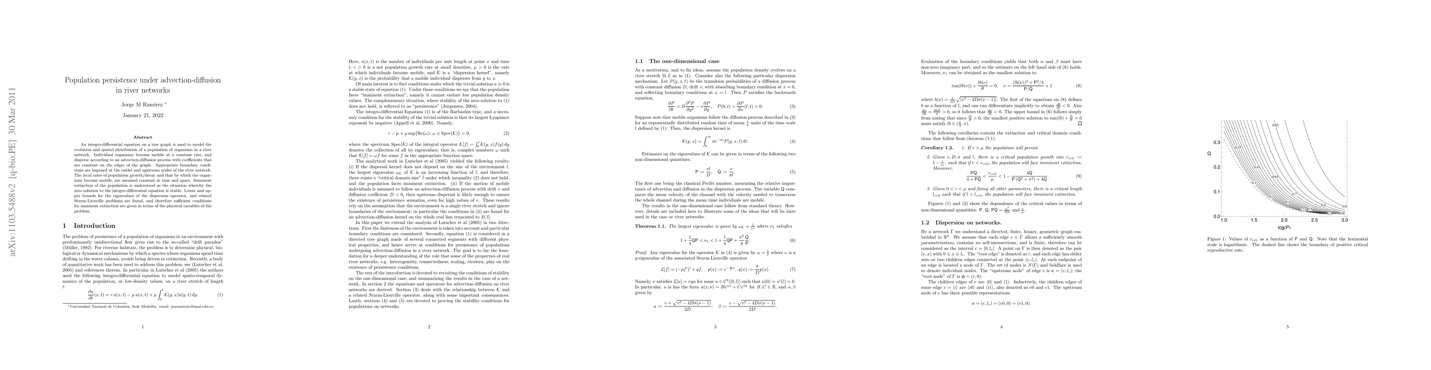 This paper models population dynamics in river networks using an integro-differential equation on a tree graph, considering advection-diffusion processes and constant growth/mobility rates. It determines conditions for population extinction by finding bounds for the dispersion operator's eigenvalues.