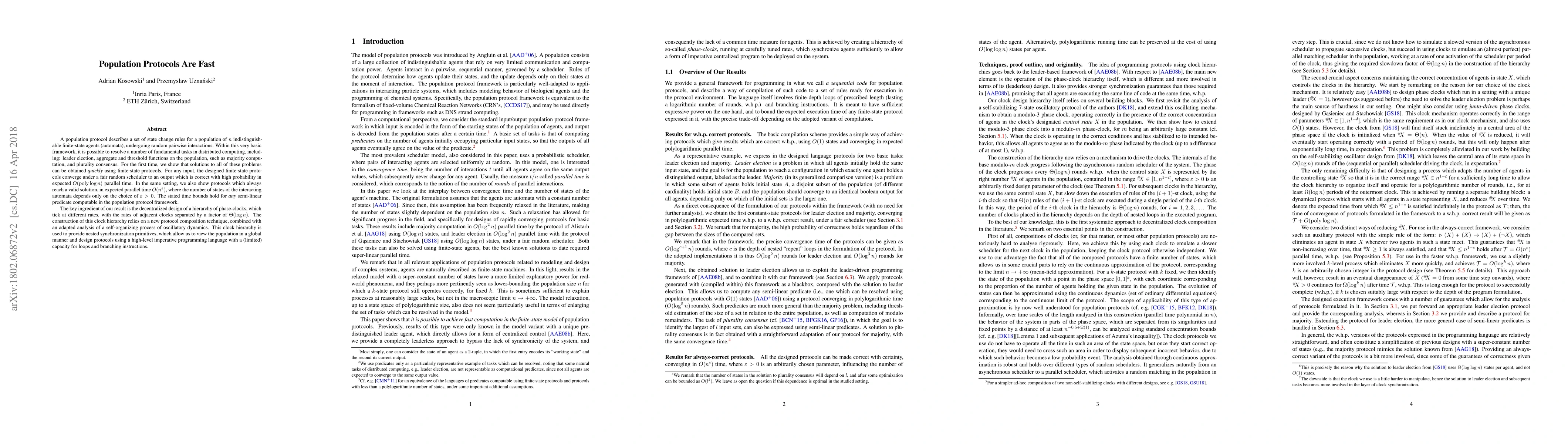 This paper demonstrates that population protocols can efficiently solve fundamental distributed computing tasks such as leader election and majority computation in expected $O(\mathrm{poly} \log n)$ parallel time. The key innovation is a decentralized hierarchy of phase-clocks, which enables nested synchronization primitives and allows for high-level protocol design.