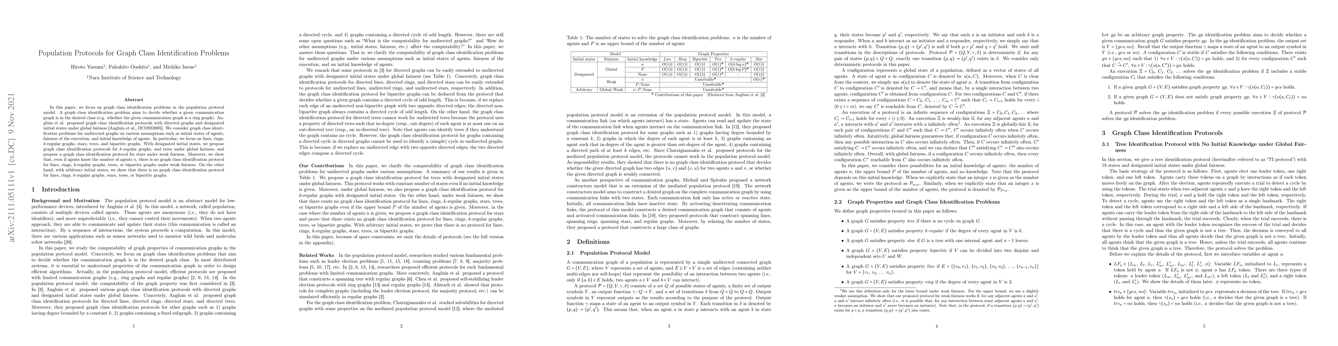 In this paper, we focus on graph class identification problems in the population protocol model. A graph class identification problem aims to decide whether a given communication graph is in the desired class (e.g. whether the given communication graph is a ring graph). Angluin et al. proposed graph class identification protocols with directed graphs and designated initial states under global fairness [Angluin et al., DCOSS2005]. We consider graph class identification problems for undirected graphs on various assumptions such as initial states of agents, fairness of the execution, and initial knowledge of agents. In particular, we focus on lines, rings, $k$-regular graphs, stars, trees, and bipartite graphs. With designated initial states, we propose graph class identification protocols for $k$-regular graphs, and trees under global fairness, and propose a graph class identification protocol for stars under weak fairness. Moreover, we show that, even if agents know the number of agents $n$, there is no graph class identification protocol for lines, rings, $k$-regular graphs, trees, or bipartite graphs under weak fairness. On the other hand, with arbitrary initial states, we show that there is no graph class identification protocol for lines, rings, $k$-regular graphs, stars, trees, or bipartite graphs.