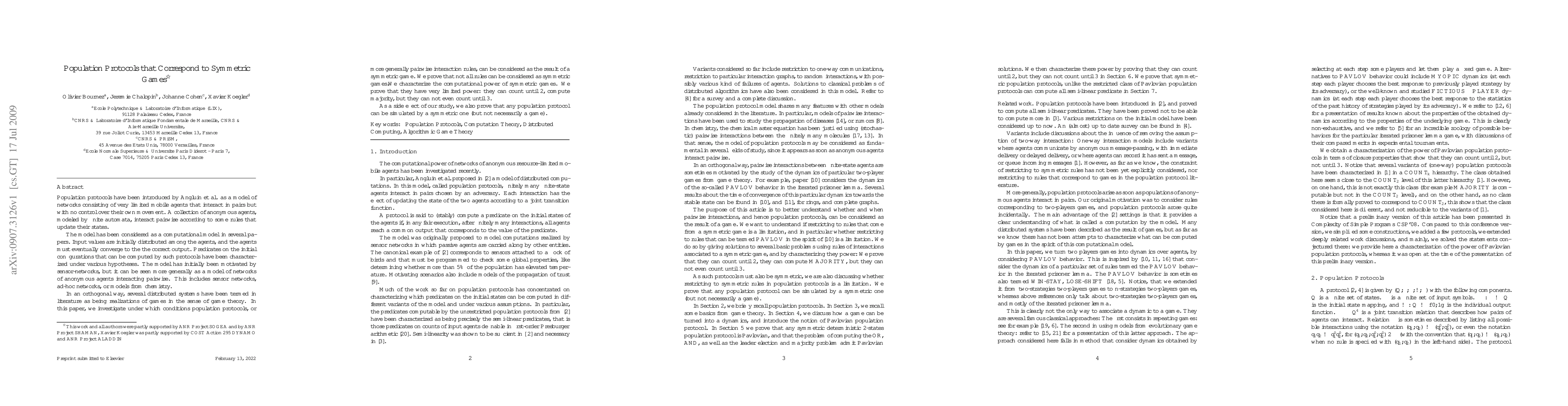 This paper explores the conditions under which population protocols can be viewed as symmetric games. It demonstrates that while not all protocols correspond to symmetric games, some basic protocols can, and any population protocol can be simulated by a symmetric one.
