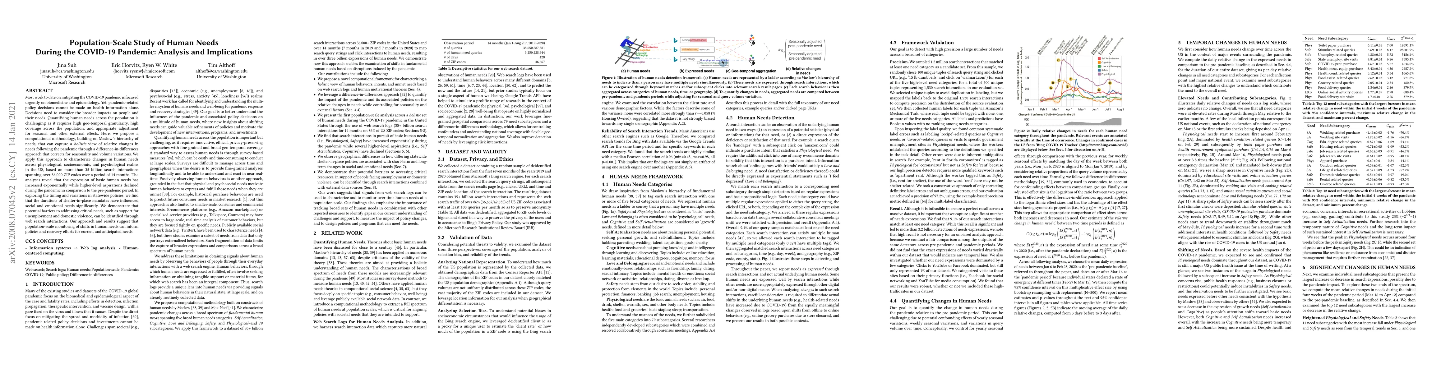 Most work to date on mitigating the COVID-19 pandemic is focused urgently on biomedicine and epidemiology. Yet, pandemic-related policy decisions cannot be made on health information alone. Decisions need to consider the broader impacts on people and their needs. Quantifying human needs across the population is challenging as it requires high geo-temporal granularity, high coverage across the population, and appropriate adjustment for seasonal and other external effects. Here, we propose a computational methodology, building on Maslow's hierarchy of needs, that can capture a holistic view of relative changes in needs following the pandemic through a difference-in-differences approach that corrects for seasonality and volume variations. We apply this approach to characterize changes in human needs across physiological, socioeconomic, and psychological realms in the US, based on more than 35 billion search interactions spanning over 36,000 ZIP codes over a period of 14 months. The analyses reveal that the expression of basic human needs has increased exponentially while higher-level aspirations declined during the pandemic in comparison to the pre-pandemic period. In exploring the timing and variations in statewide policies, we find that the durations of shelter-in-place mandates have influenced social and emotional needs significantly. We demonstrate that potential barriers to addressing critical needs, such as support for unemployment and domestic violence, can be identified through web search interactions. Our approach and results suggest that population-scale monitoring of shifts in human needs can inform policies and recovery efforts for current and anticipated needs.