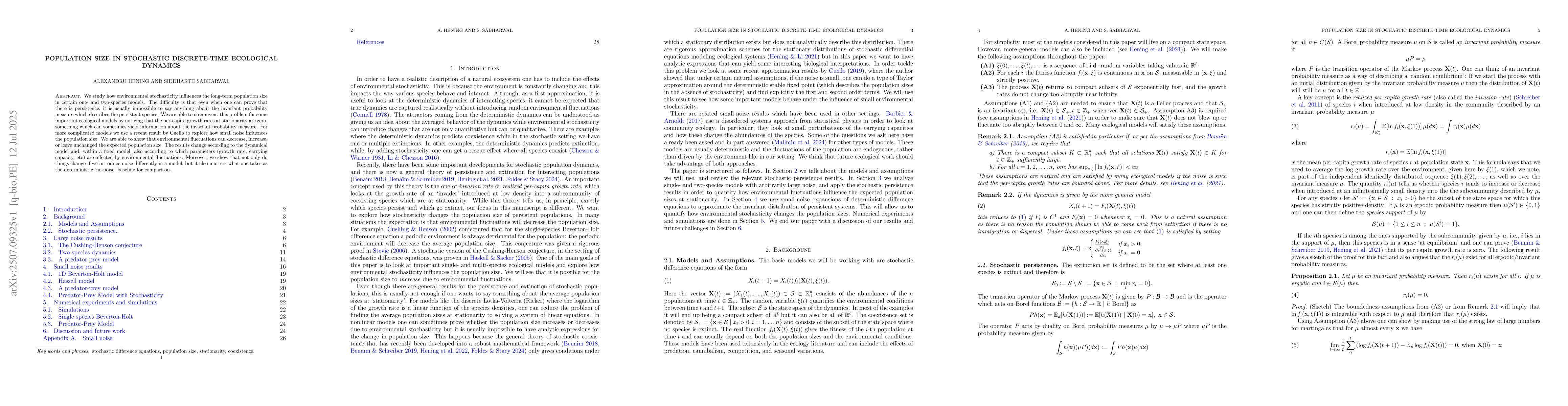 We study how environmental stochasticity influences the long-term population size in certain one- and two-species models. The difficulty is that even when one can prove that there is persistence, it is usually impossible to say anything about the invariant probability measure which describes the persistent species. We are able to circumvent this problem for some important ecological models by noticing that the per-capita growth rates at stationarity are zero, something which can sometimes yield information about the invariant probability measure. For more complicated models we use a recent result by Cuello to explore how small noise influences the population size. We are able to show that environmental fluctuations can decrease, increase, or leave unchanged the expected population size. The results change according to the dynamical model and, within a fixed model, also according to which parameters (growth rate, carrying capacity, etc) are affected by environmental fluctuations. Moreover, we show that not only do things change if we introduce noise differently in a model, but it also matters what one takes as the deterministic `no-noise' baseline for comparison.