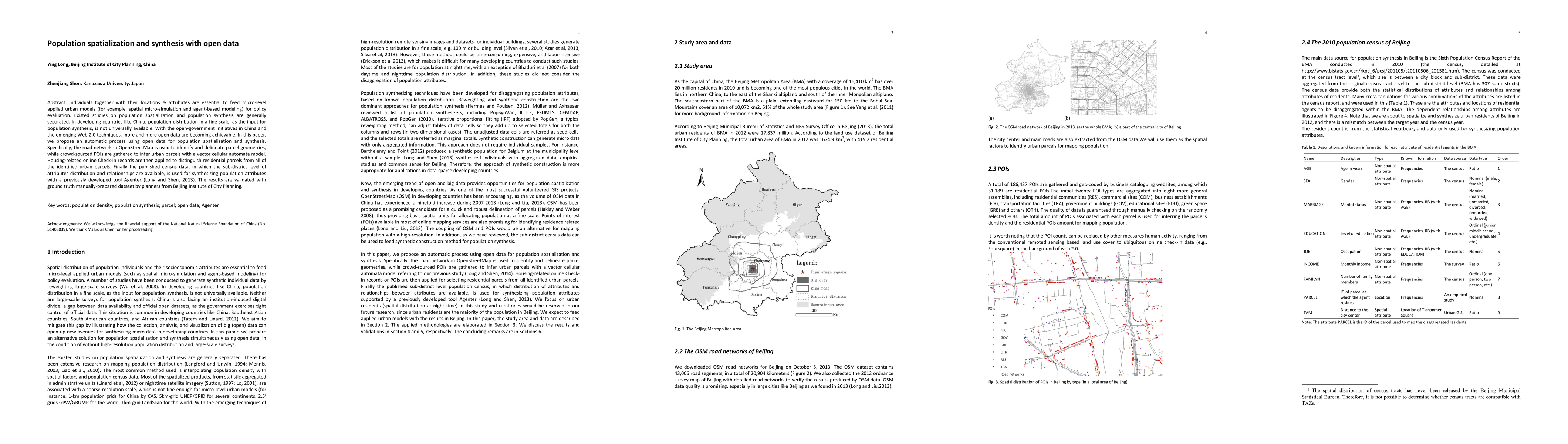Individuals together with their locations & attributes are essential to feed micro-level applied urban models (for example, spatial micro-simulation and agent-based modeling) for policy evaluation. Existed studies on population spatialization and population synthesis are generally separated. In developing countries like China, population distribution in a fine scale, as the input for population synthesis, is not universally available. With the open-government initiatives in China and the emerging Web 2.0 techniques, more and more open data are becoming achievable. In this paper, we propose an automatic process using open data for population spatialization and synthesis. Specifically, the road network in OpenStreetMap is used to identify and delineate parcel geometries, while crowd-sourced POIs are gathered to infer urban parcels with a vector cellular automata model. Housing-related online Check-in records are then applied to distinguish residential parcels from all of the identified urban parcels. Finally the published census data, in which the sub-district level of attributes distribution and relationships are available, is used for synthesizing population attributes with a previously developed tool Agenter (Long and Shen, 2013). The results are validated with ground truth manually-prepared dataset by planners from Beijing Institute of City Planning.