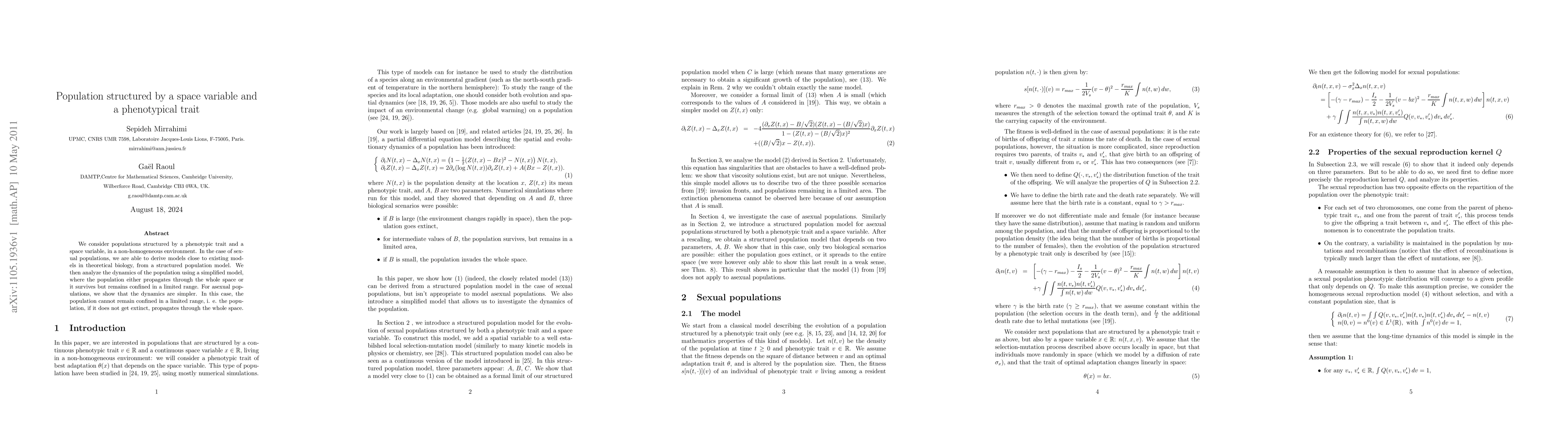 We consider populations structured by a phenotypic trait and a space variable, in a non-homogeneous environment. In the case of sex- ual populations, we are able to derive models close to existing mod- els in theoretical biology, from a structured population model. We then analyze the dynamics of the population using a simplified model, where the population either propagates through the whole space or it survives but remains confined in a limited range. For asexual pop- ulations, we show that the dynamics are simpler. In this case, the population cannot remain confined in a limited range, i.e. the popu- lation, if it does not get extinct, propagates through the whole space.