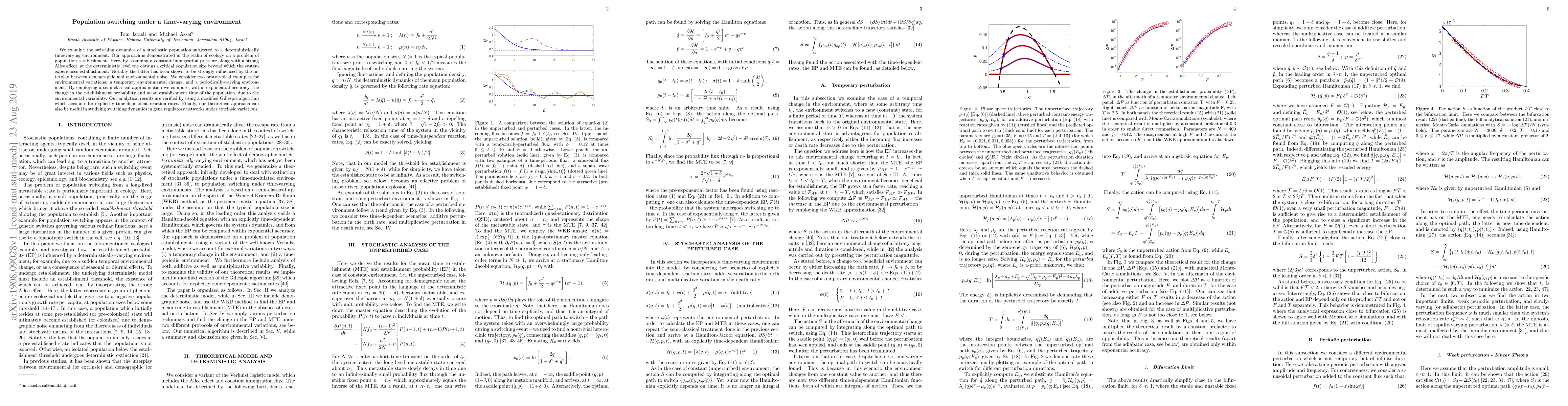 This paper investigates the dynamics of stochastic population switching in a time-varying environment, focusing on ecological population establishment under a strong Allee effect. The study employs semi-classical approximation and a modified Gillespie algorithm to analyze the impact of environmental variability on establishment probability and time, with applications extending to gene regulatory networks.