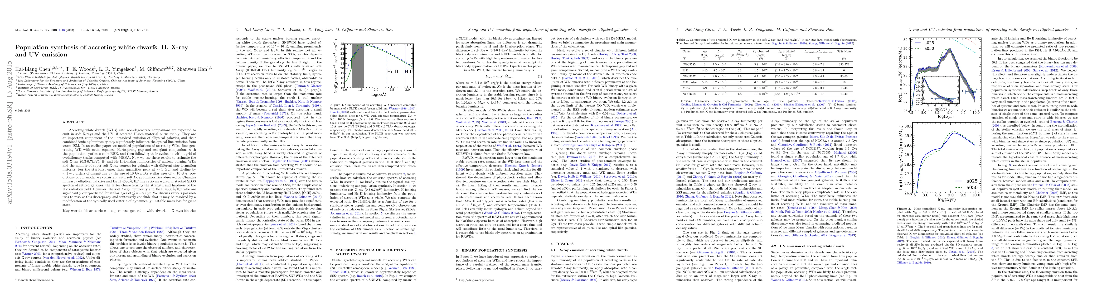 This paper estimates the soft X-ray and UV emission from accreting white dwarfs with non-degenerate companions, finding that their combined ionizing luminosity can significantly influence the optical line emission from the warm ISM. The model predicts a peak in soft X-ray luminosity and He II-ionizing emission at around 1 Gyr, which declines by orders of magnitude by 10 Gyr, consistent with observations in older elliptical galaxies but overpredicting younger galaxies.
