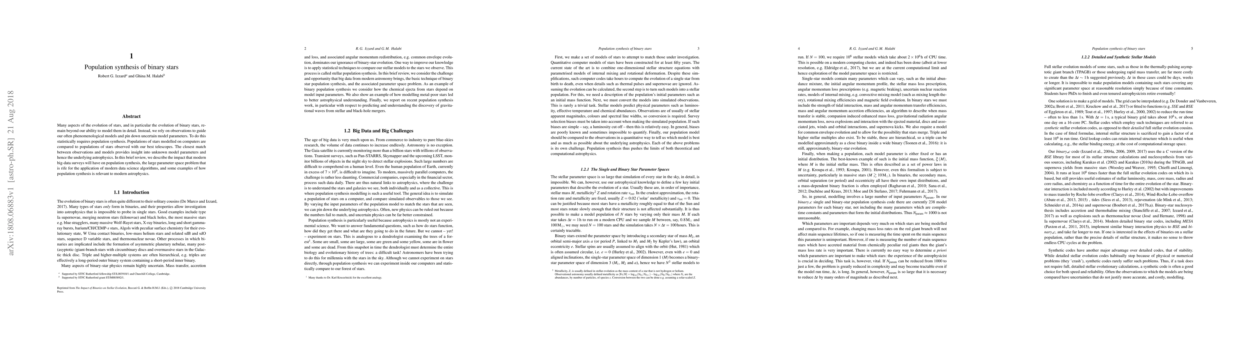 Many aspects of the evolution of stars, and in particular the evolution of binary stars, remain beyond our ability to model them in detail. Instead, we rely on observations to guide our often phenomenological models and pin down uncertain model parameters. To do this statistically requires population synthesis. Populations of stars modelled on computers are compared to populations of stars observed with our best telescopes. The closest match between observations and models provides insight into unknown model parameters and hence the underlying astrophysics. In this brief review, we describe the impact that modern big-data surveys will have on population synthesis, the large parameter space problem that is rife for the application of modern data science algorithms, and some examples of how population synthesis is relevant to modern astrophysics.