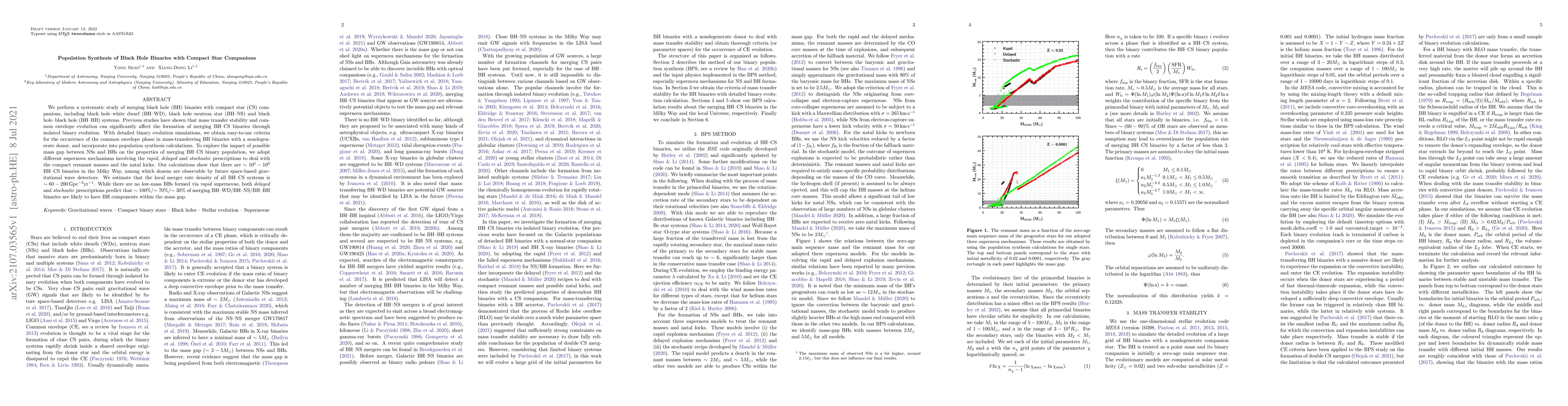 We perform a systematic study of merging black hole (BH) binaries with compact star (CS) companions, including black hole--white dwarf (BH--WD), black hole--neutron star (BH--NS) and black hole--black hole (BH--BH) systems. Previous studies have shown that mass transfer stability and common envelope evolution can significantly affect the formation of merging BH--CS binaries through isolated binary evolution. With detailed binary evolution simulations, we obtain easy-to-use criteria for the occurrence of the common envelope phase in mass-transferring BH binaries with a nondegenerate donor, and incorporate into population synthesis calculations. To explore the impact of possible mass gap between NSs and BHs on the properties of merging BH--CS binary population, we adopt different supernova mechanisms involving the \textit{rapid}, \textit{delayed} and \textit{stochastic} prescriptions to deal with the compact remnant masses and the natal kicks. Our calculations show that there are $ \sim 10^{5} -10^{6}$ BH--CS binaries in the Milky Way, among which dozens are observable by future space-based gravitational wave detectors. We estimate that the local merger rate density of all BH--CS systems is $ \sim 60-200 \,\rm Gpc^{-3}yr^{-1}$. While there are no low-mass BHs formed via \textit{rapid} supernovae, both \textit{delayed} and \textit{stochastic} prescriptions predict that $ \sim 100\% $/$ \sim 70\% $/$ \sim 30\% $ of merging BH--WD/BH--NS/BH--BH binaries are likely to have BH components within the mass gap.