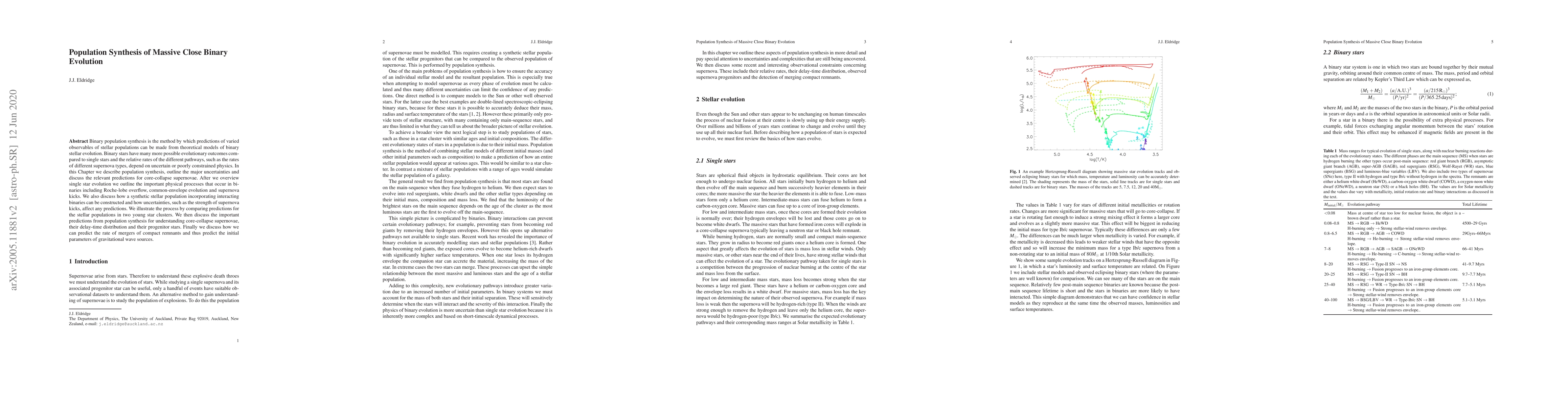 Binary population synthesis is the method by which predictions of varied observables of stellar populations can be made from theoretical models of binary stellar evolution. Binary stars have many more possible evolutionary outcomes compared to single stars and the relative rates of the different pathways, such as the rates of different supernova types, depend on uncertain or poorly constrained physics. In this Chapter we describe population synthesis, outline the major uncertainties and discuss the relevant predictions for core-collapse supernovae. After we overview single star evolution we outline the important physical processes that occur in binaries including Roche-lobe overflow, common-envelope evolution and supernova kicks. We also discuss how a synthetic stellar population incorporating interacting binaries can be constructed and how uncertainties, such as the strength of supernova kicks, affect any predictions. We illustrate the process by comparing predictions for the stellar populations in two young star clusters. We then discuss the important predictions from population synthesis for understanding core-collapse supernovae, their delay-time distribution and their progenitor stars. Finally we discuss how we can predict the rate of mergers of compact remnants and thus predict the initial parameters of gravitational wave sources.