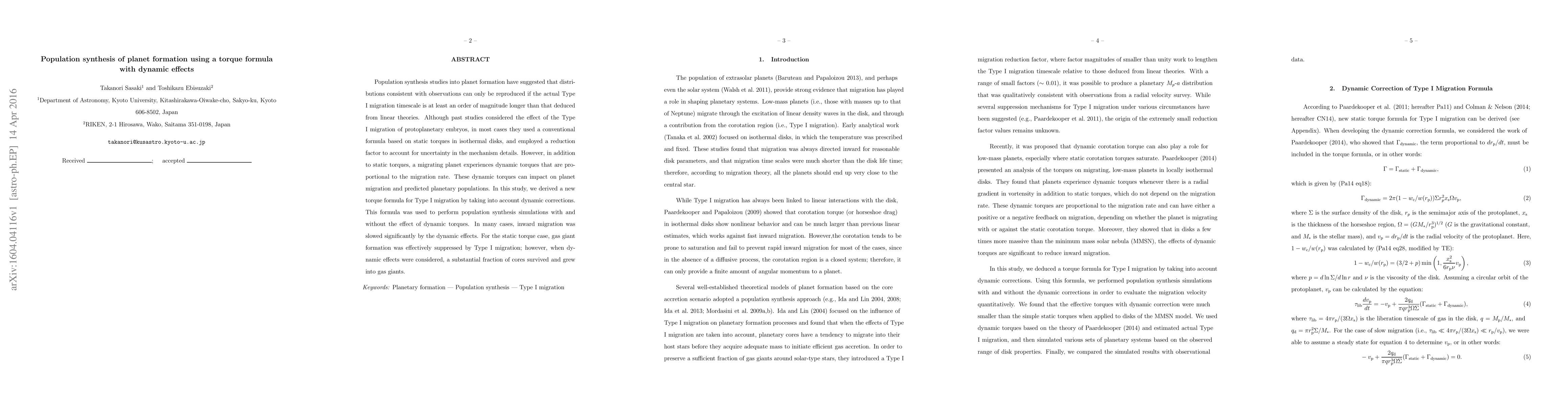 This paper develops a new torque formula for Type I migration in planet formation that includes dynamic effects, showing that dynamic torques significantly slow inward migration and allow more gas giants to form compared to models using only static torques.