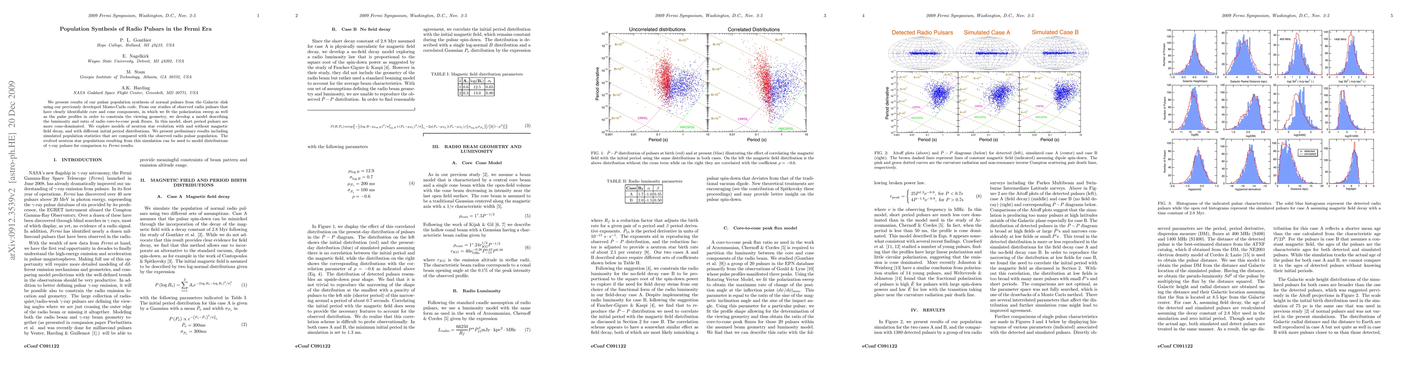 This paper uses a Monte-Carlo code to synthesize the population of normal pulsars in the Galactic disk, focusing on the polarization sweep and pulse profiles to model luminosity and flux ratios. The study finds short period pulsars are more cone-dominated and explores neutron star evolution models, comparing simulated results to observed radio pulsars and suggesting applications for gamma-ray pulsar modeling in the Fermi era.