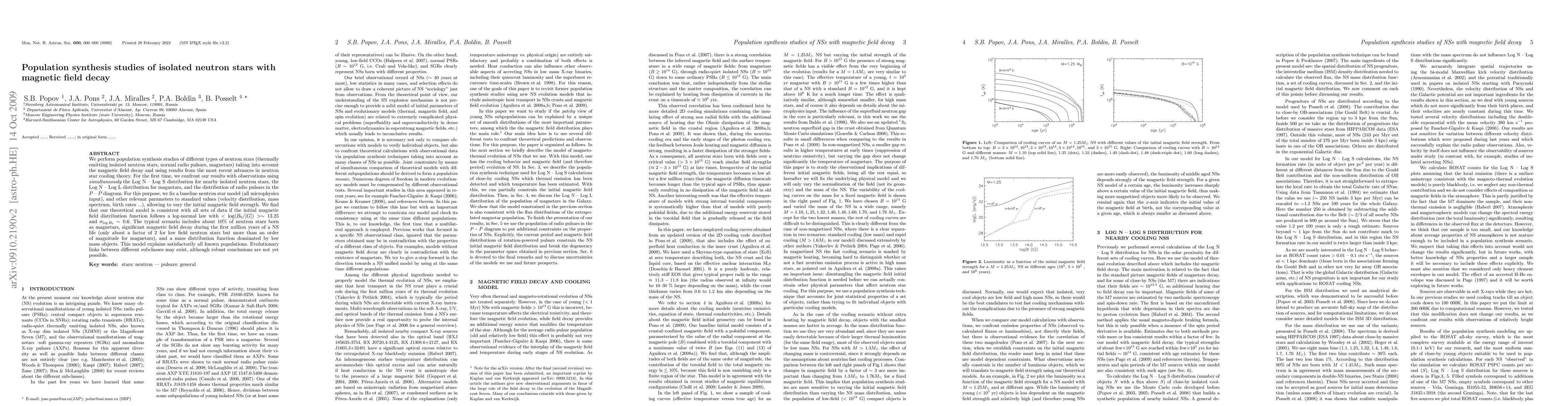 We perform population synthesis studies of different types of neutron stars (thermally emitting isolated neutron stars, normal radio pulsars, magnetars) taking into account the magnetic field decay and using results from the most recent advances in neutron star cooling theory. For the first time, we confront our results with observations using {\it simultaneously} the Log N -- Log S distribution for nearby isolated neutron stars, the Log N -- Log L distribution for magnetars, and the distribution of radio pulsars in the $P$ -- $\dot P$ diagram. For this purpose, we fix a baseline neutron star model (all microphysics input), and other relevant parameters to standard values (velocity distribution, mass spectrum, birth rates ...), allowing to vary the initial magnetic field strength. We find that our theoretical model is consistent with all sets of data if the initial magnetic field distribution function follows a log-normal law with $<\log (B_0/[G])>\sim 13.25$ and $\sigma_{\log B_0}\sim 0.6$. The typical scenario includes about 10% of neutron stars born as magnetars, significant magnetic field decay during the first million years of a NS life (only about a factor of 2 for low field neutron stars but more than an order of magnitude for magnetars), and a mass distribution function dominated by low mass objects. This model explains satisfactorily all known populations. Evolutionary links between different subclasses may exist, although robust conclusions are not yet possible.