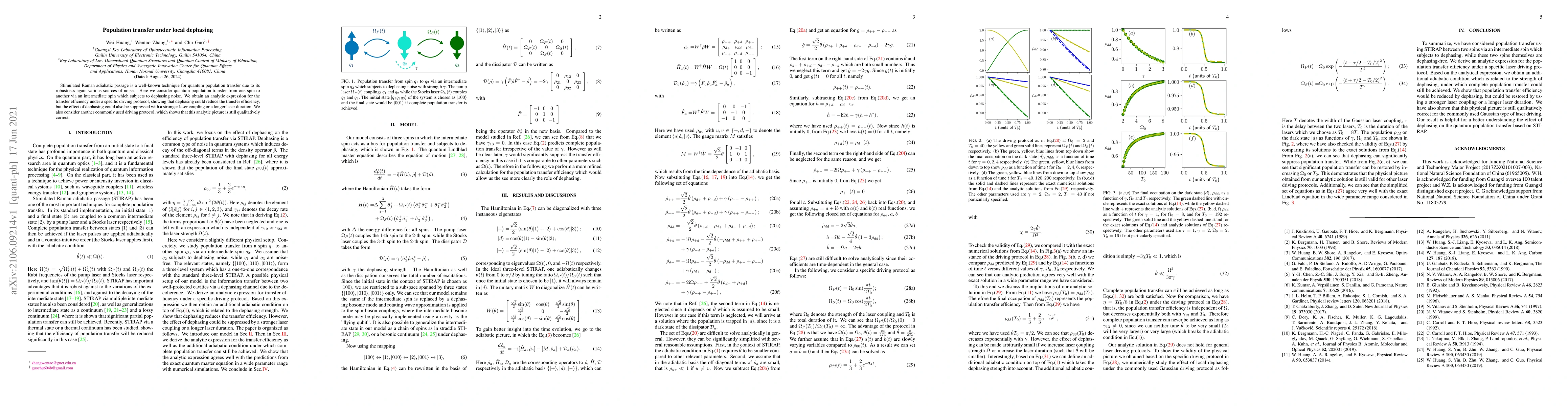 Stimulated Raman adiabatic passage is a well-known technique for quantum population transfer due to its robustness again various sources of noises. Here we consider quantum population transfer from one spin to another via an intermediate spin which subjects to dephasing noise. We obtain an analytic expression for the transfer efficiency under a specific driving protocol, showing that dephasing could reduce the transfer efficiency, but the effect of dephasing could also be suppressed with a stronger laser coupling or a longer laser duration. We also consider another commonly used driving protocol, which shows that this analytic picture is still qualitatively correct.