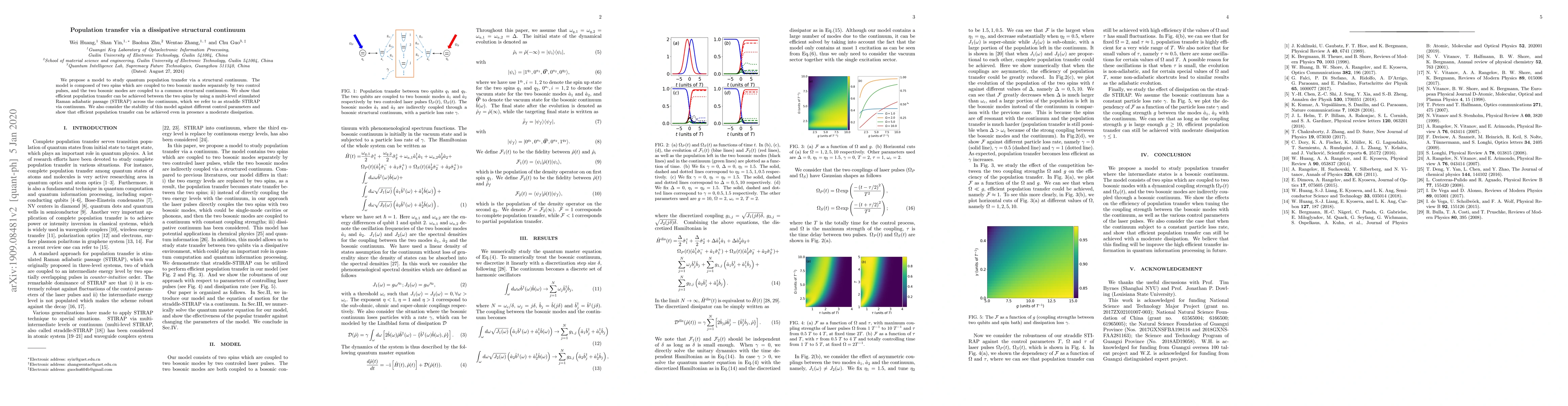 The research proposes a model for quantum population transfer via a structural continuum, involving two spins coupled to two bosonic modes by control pulses, and the modes coupled to a common continuum. The model uses a discretized approach for numerical treatment of the bosonic continuum, converting it into a set of harmonic oscillators.