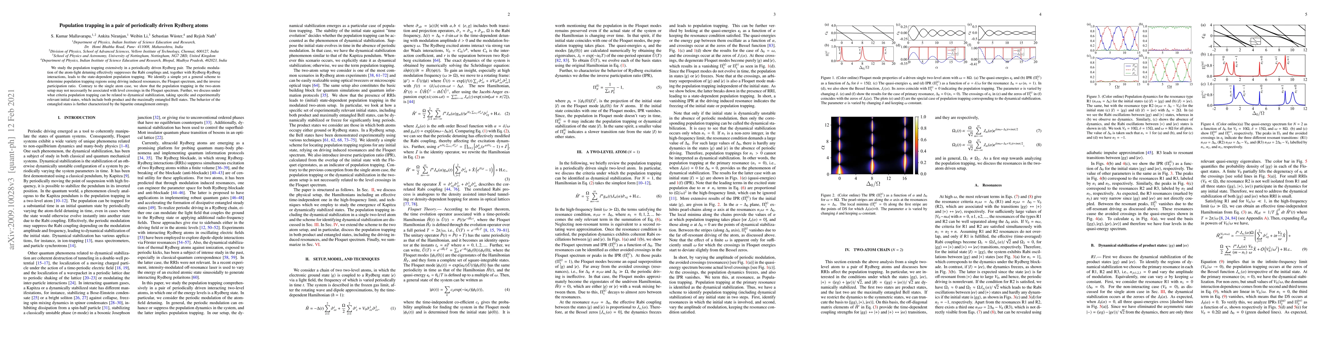 This paper explores population trapping in a periodically driven pair of Rydberg atoms, demonstrating how modulation of atom-light detuning and Rydberg interactions can lead to state-dependent trapping. The authors propose a method to identify trapping regions using driving induced resonances and analyze the entanglement dynamics of initial states, including Bell states, using bipartite entanglement entropy.