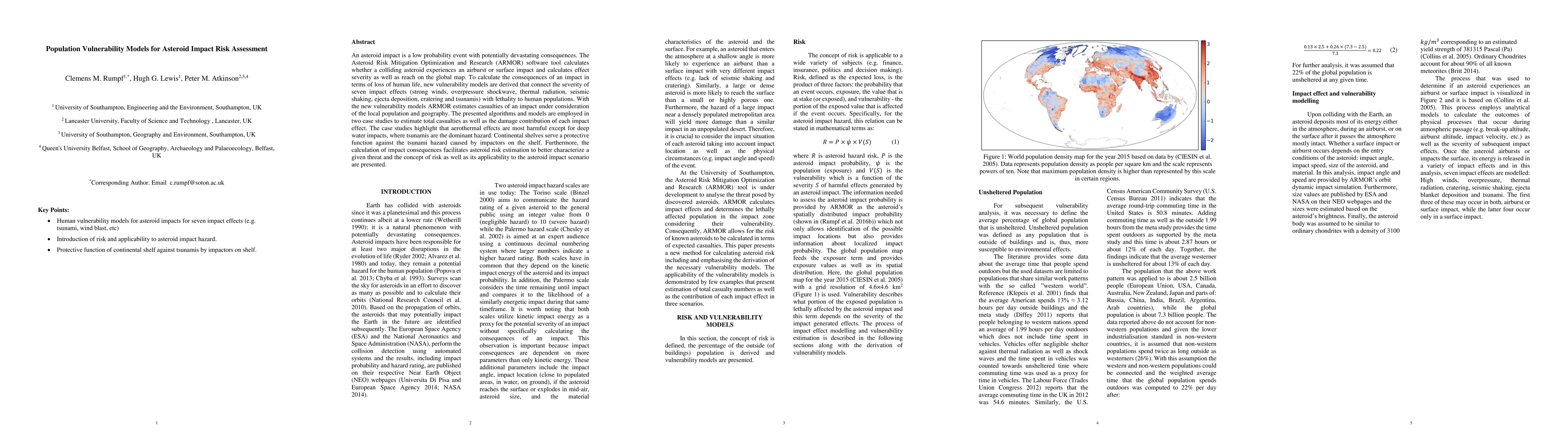 This paper introduces new vulnerability models for the ARMOR software that assess asteroid impact risks by calculating casualties based on seven impact effects. The models highlight that aerothermal effects are most harmful, except in deep water where tsunamis dominate, with continental shelves providing protection against tsunami hazards.