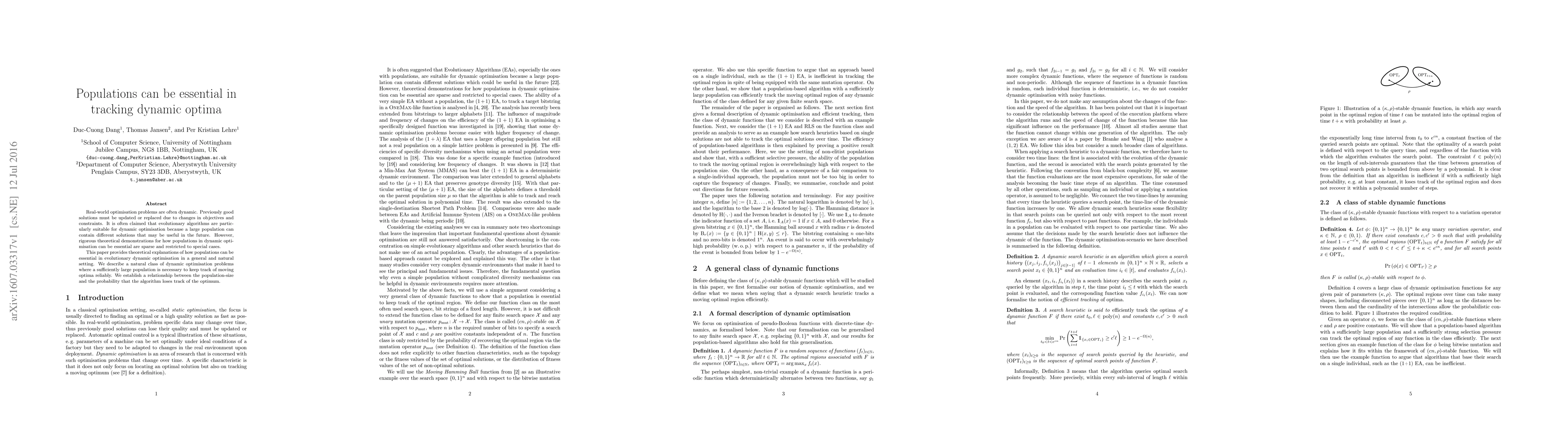 Real-world optimisation problems are often dynamic. Previously good solutions must be updated or replaced due to changes in objectives and constraints. It is often claimed that evolutionary algorithms are particularly suitable for dynamic optimisation because a large population can contain different solutions that may be useful in the future. However, rigorous theoretical demonstrations for how populations in dynamic optimisation can be essential are sparse and restricted to special cases. This paper provides theoretical explanations of how populations can be essential in evolutionary dynamic optimisation in a general and natural setting. We describe a natural class of dynamic optimisation problems where a sufficiently large population is necessary to keep track of moving optima reliably. We establish a relationship between the population-size and the probability that the algorithm loses track of the optimum.