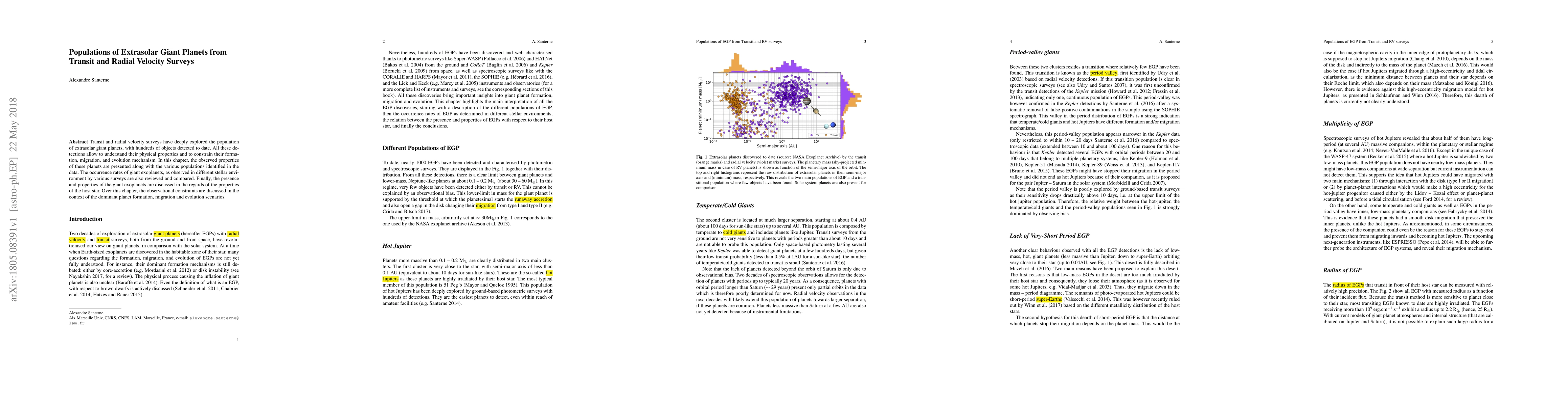 This paper reviews the populations of extrasolar giant planets detected through transit and radial velocity surveys, detailing their physical properties and formation mechanisms. It compares occurrence rates across different stellar environments and discusses the influence of host star properties on giant exoplanets, considering observational constraints and prevailing formation theories.
