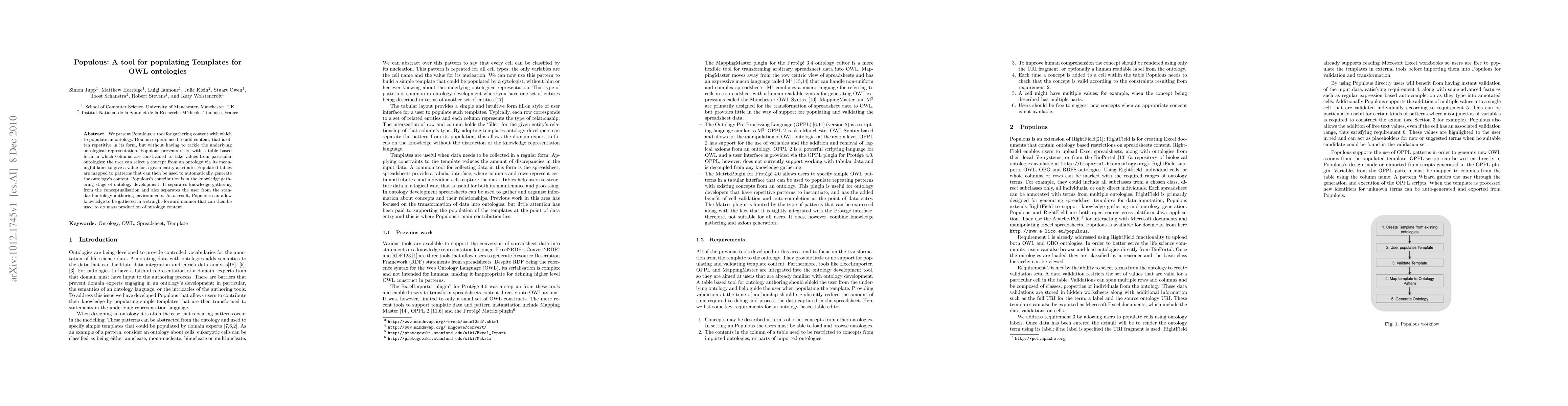 Populous is a tool designed to simplify the process of populating ontology templates by allowing domain experts to input data through a table-based form, with constraints based on existing ontologies. It facilitates mass generation of ontology content by separating knowledge gathering from conceptualization.