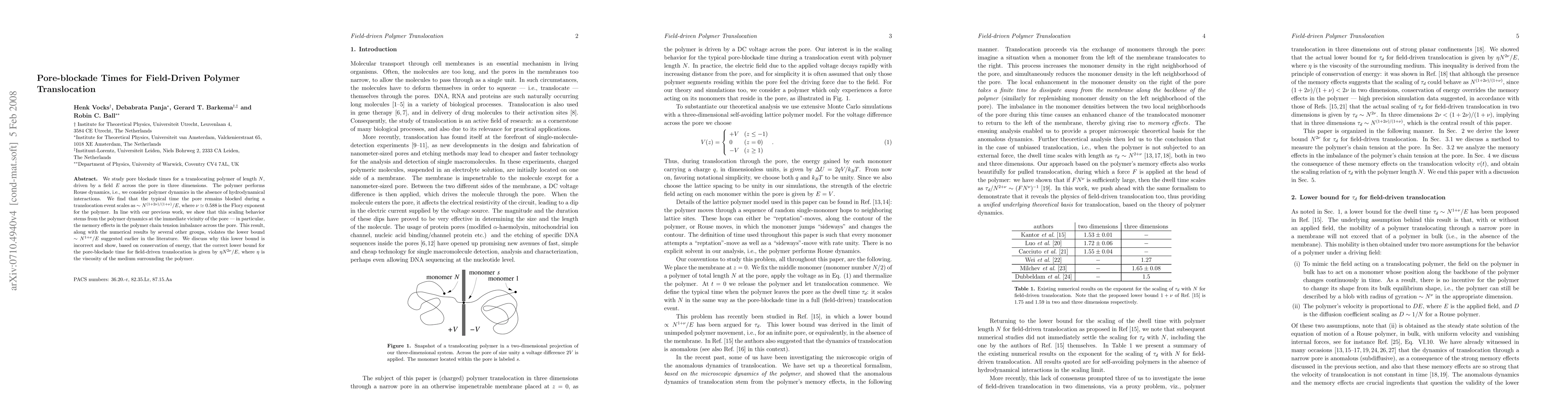 This paper investigates the pore blockade times for a polymer driven by an electric field during translocation through a three-dimensional pore, revealing a scaling behavior that contradicts earlier lower bounds. The study finds that the blockade time scales as $\sim N^{(1+2\nu)/(1+\nu)}/E$, showing that memory effects in polymer chain tension imbalance are key, and establishes a new lower bound $\eta N^{2\nu}/E$ based on energy conservation.
