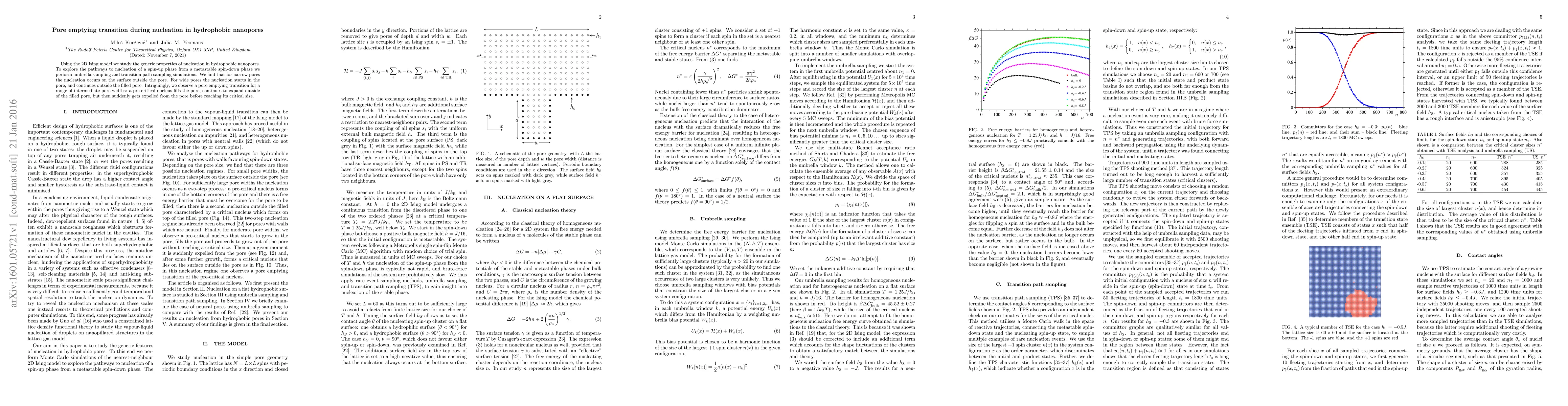 This paper investigates nucleation behavior in hydrophobic nanopores using the 2D Ising model and simulation techniques. It finds that nucleation occurs on the surface for narrow pores and within the pore for wide pores, but for intermediate pore widths, a unique pore emptying transition occurs where a pre-critical nucleus forms, expands outside the pore, and is expelled before reaching critical size.