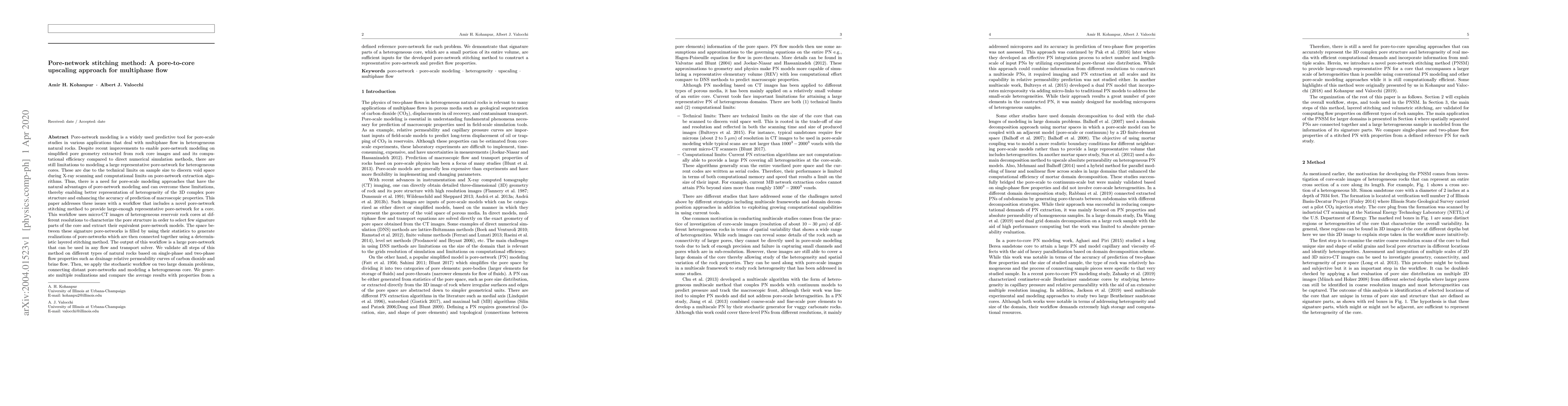 This paper introduces a pore-network stitching method to upscale pore-scale modeling for multiphase flow in heterogeneous cores, addressing limitations in sample size and computational efficiency. The method stitches together signature pore-networks extracted from CT images, filling gaps with statistically generated networks to create large, representative pore-networks validated against flow properties.