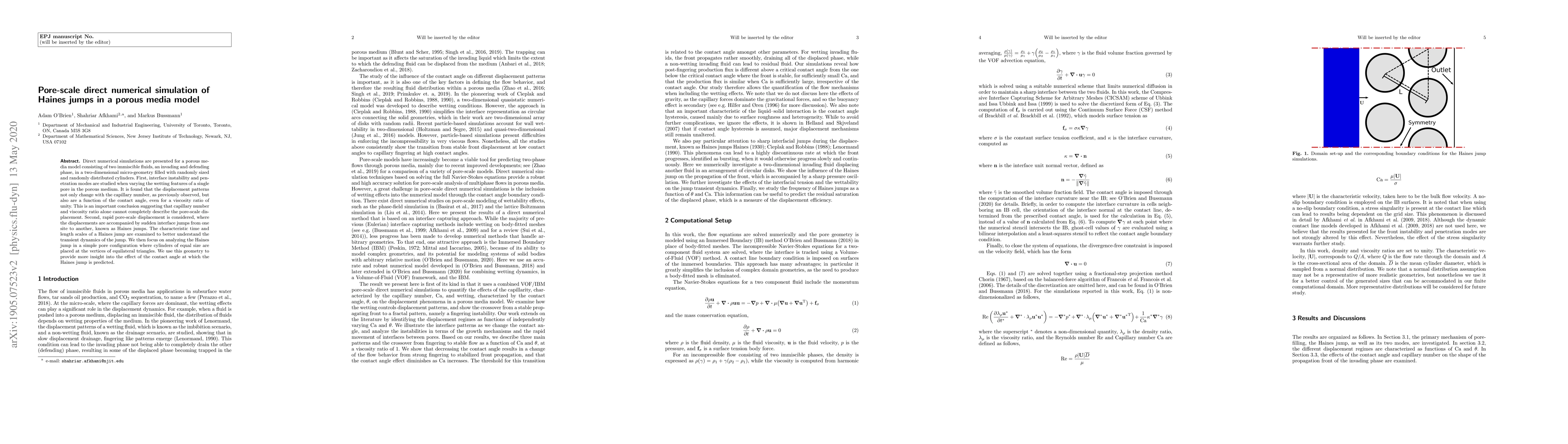 This paper presents direct numerical simulations of two-phase fluid displacement in a porous media model, revealing that pore-scale displacement patterns depend on both the capillary number and contact angle, not just the viscosity ratio. It also investigates Haines jumps, identifying characteristic time and length scales for these rapid displacement events, and analyzes their dependence on the contact angle in a simple pore geometry.