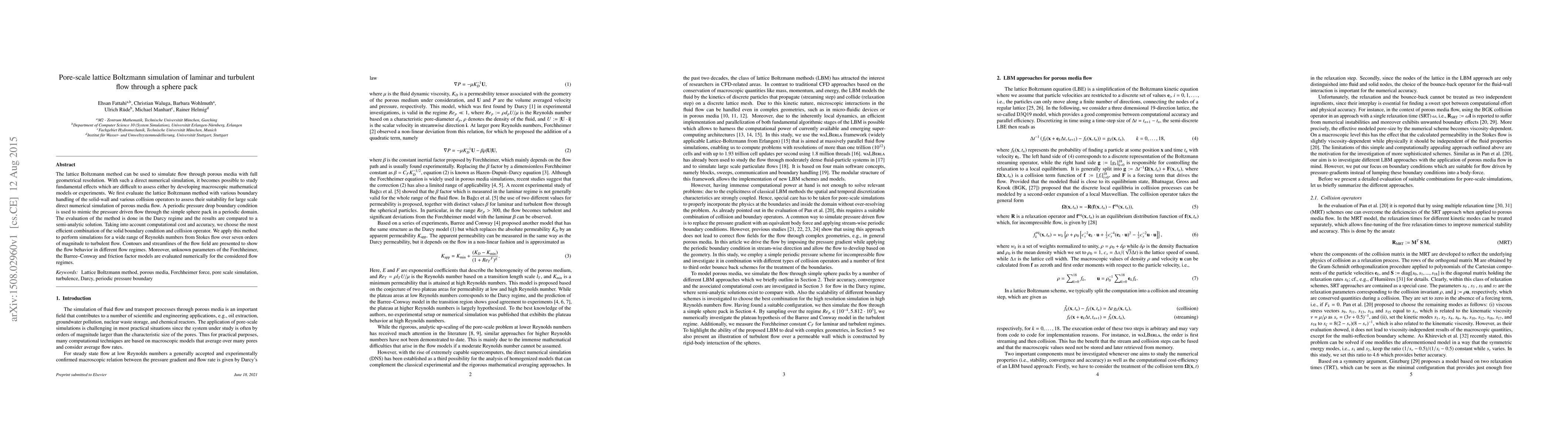 The research employs lattice Boltzmann method (LBM) simulations to study flow through periodic and random sphere packs across a wide range of Reynolds numbers. Various collision operators and boundary conditions are evaluated for their suitability in direct numerical simulations of porous media flow.