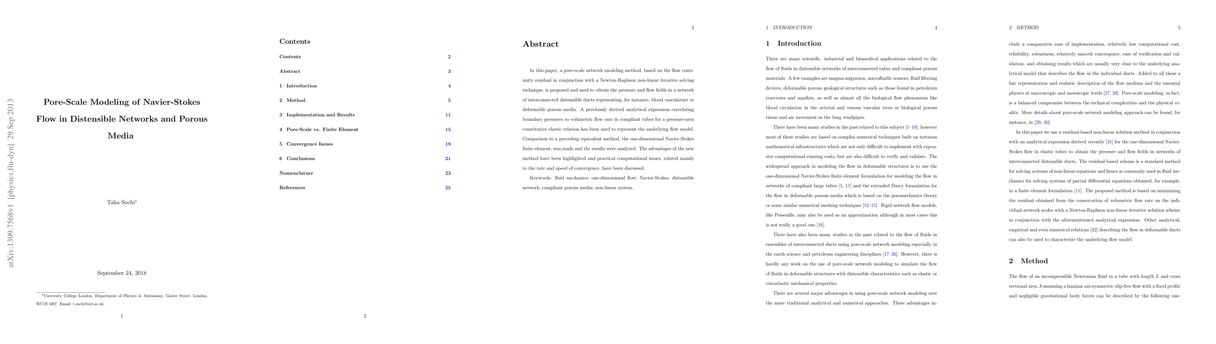 This paper proposes a pore-scale network modeling method using flow continuity and a Newton-Raphson technique to determine pressure and flow fields in distensible networks, comparing it to a one-dimensional Navier-Stokes finite element method. The new method shows advantages in computational efficiency and convergence speed.