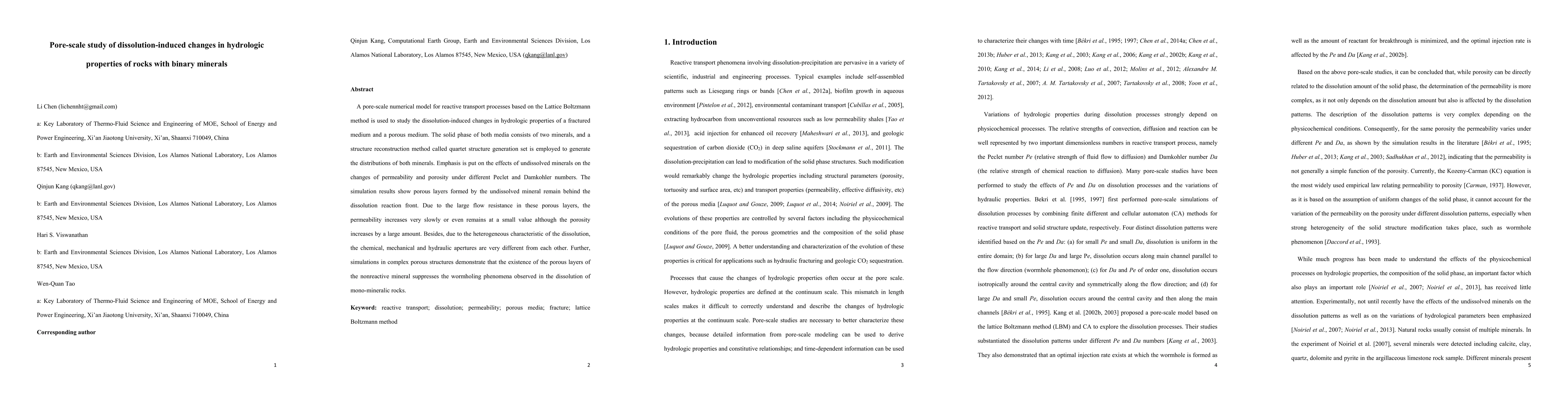 This study uses a pore-scale numerical model to investigate how dissolution alters hydrologic properties of rocks with two minerals, showing that undissolved minerals create porous layers that slow permeability increase despite significant porosity growth. The presence of nonreactive mineral layers suppresses wormhole formation compared to mono-mineralic dissolution.