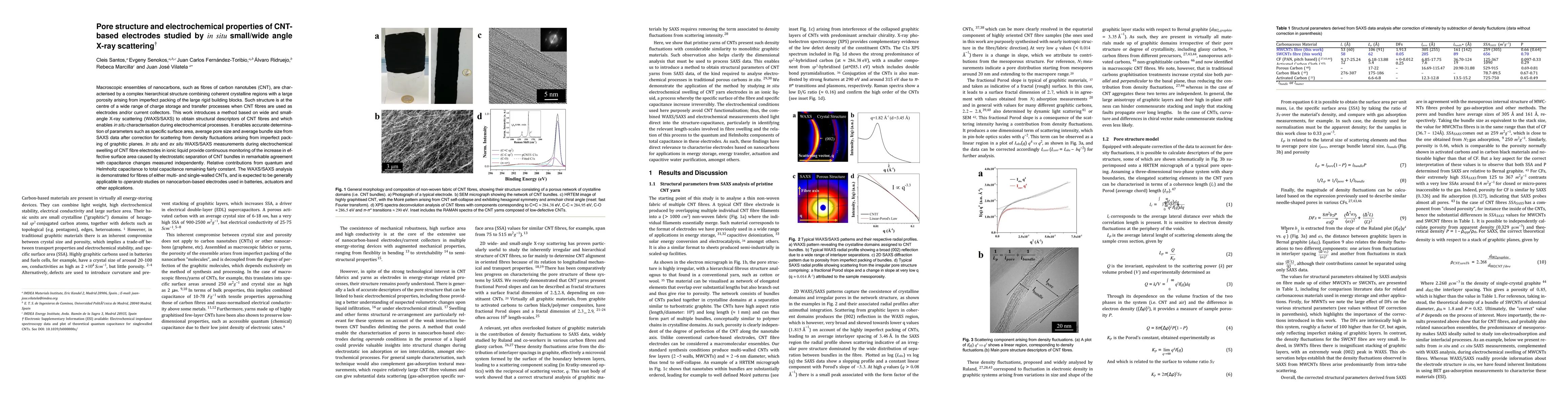 Macroscopic ensembles of nanocarbons, such as fibres of carbon nanotubes (CNT), are characterised by a complex hierarchical structure combining coherent crystalline regions with a large porosity arising from imperfect packing of the large rigid building blocks. Such structure is at the centre of a wide range of charge storage and transfer processes when CNT fibres are used as electrodes and/or current collectors. This work introduces a method based on wide and small-angle X-ray scattering (WAXS/SAXS) to obtain structural descriptors of CNT fibres and which enables in situ characterisation during electrochemical processes. It enables accurate determination of parameters such as specific surface area, average pore size and average bundle size from SAXS data after correction for scattering from density fluctuations arising from imperfect packing of graphitic planes. In situ and ex situ WAXS/SAXS measurements during electrochemical swelling of CNT fibre electrodes in ionic liquid provide continuous monitoring of the increase in effective surface area caused by electrostatic separation of CNT bundles in remarkable agreement with capacitance changes measured independently. Relative contributions from quantum and Helmholtz capacitance to total capacitance remaining fairly constant. The WAXS/SAXS analysis is demonstrated for fibres of either multi- and single-walled CNTs, and is expected to be generally applicable to operando studies on nanocarbon-based electrodes used in batteries, actuators and other applications