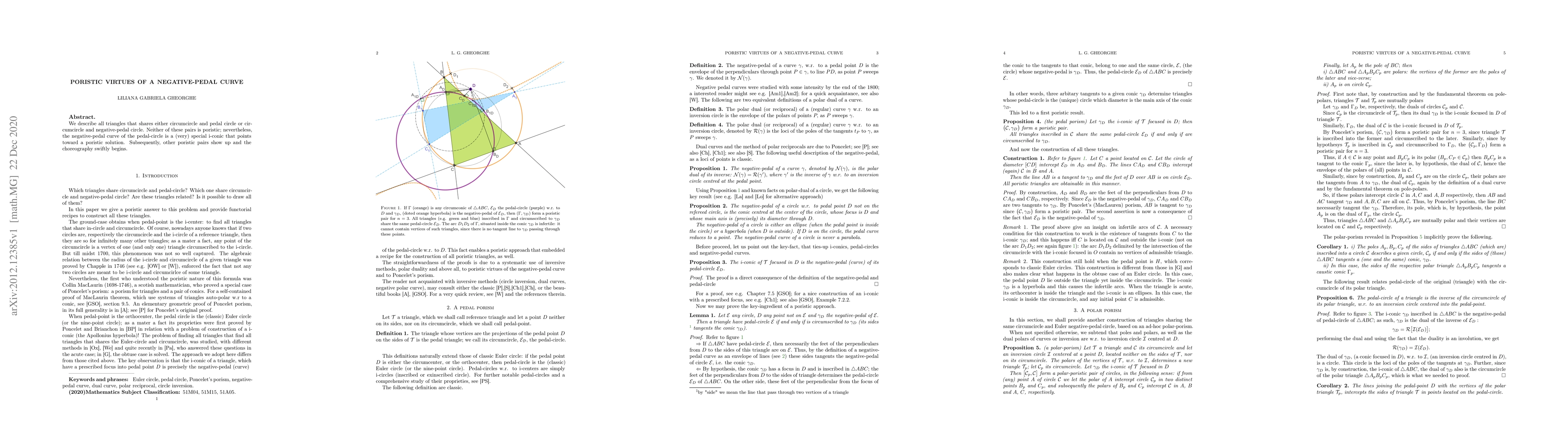 We describe all triangles that shares either circumcircle and pedal circle or circumcircle and negative-pedal circle. Neither of these pairs is poristic; nevertheless, the negative-pedal curve of the pedal-circle is a (very) special i-conic that points toward a poristic solution. Subsequently, other poristic pairs show up and the choreography swiftly begins.