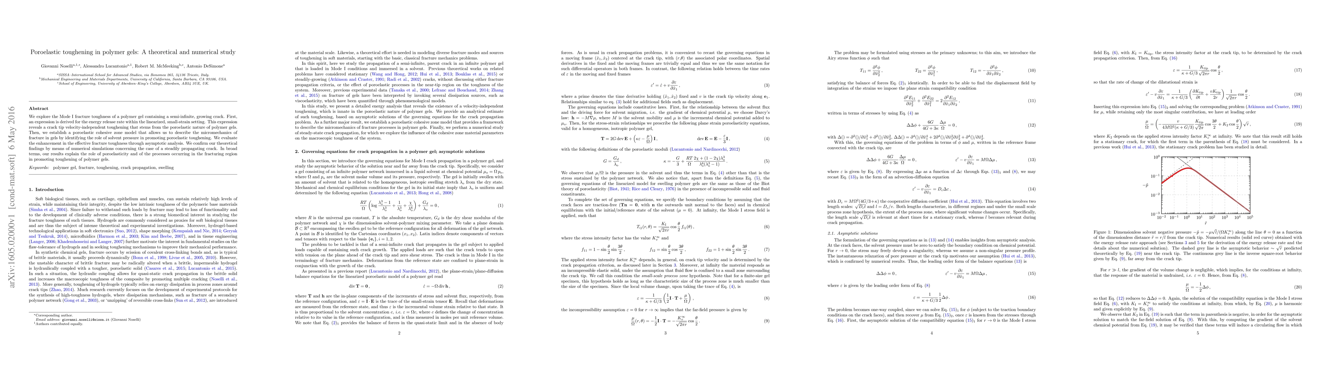 This paper derives a theoretical expression for the energy release rate in polymer gels, revealing poroelastic toughening independent of crack velocity. It introduces a poroelastic cohesive zone model to describe fracture mechanics, confirming enhanced fracture toughness through numerical simulations and asymptotic analysis.