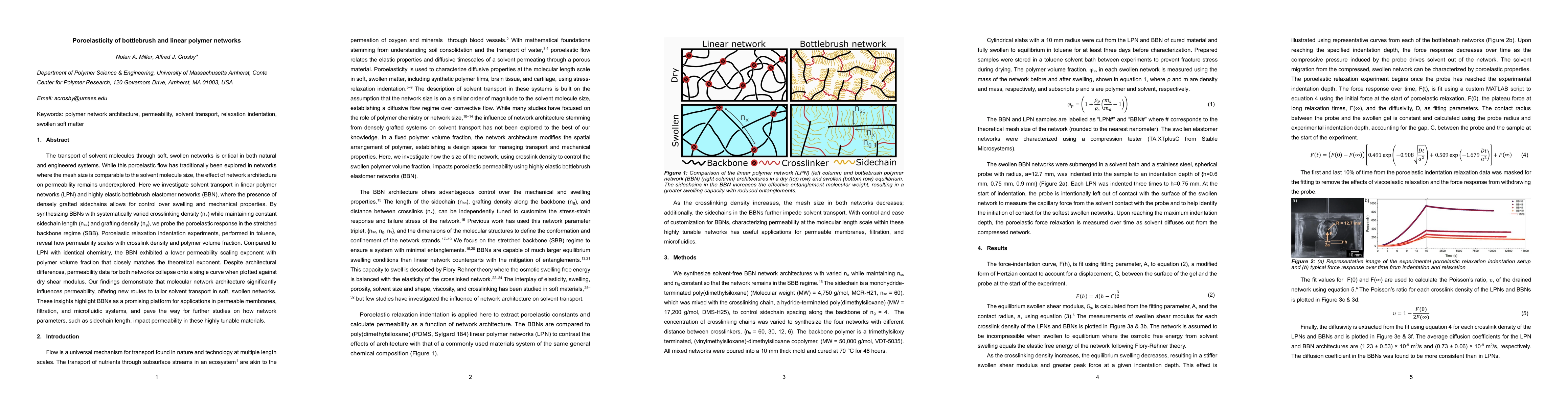 The transport of solvent molecules through soft, swollen networks is critical in both natural and engineered systems. While this poroelastic flow has traditionally been explored in networks where the mesh size is comparable to the solvent molecule size, the effect of network architecture on permeability remains underexplored. Here we investigate solvent transport in linear polymer networks (LPN) and highly elastic bottlebrush elastomer networks (BBN), where the presence of densely grafted sidechains allows for control over swelling and mechanical properties. By synthesizing BBNs with systematically varied crosslinking density while maintaining constant sidechain length and grafting density, we probe the poroelastic response in the stretched backbone regime (SBB). Poroelastic relaxation indentation experiments, performed in toluene, reveal how permeability scales with crosslink density and polymer volume fraction. Compared to LPN with identical chemistry, the BBN exhibited a lower permeability scaling exponent with polymer volume fraction that closely matches the theoretical exponent. Despite architectural differences, permeability data for both networks collapse onto a single curve when plotted against dry shear modulus. Our findings demonstrate that molecular network architecture significantly influences permeability, offering new routes to tailor solvent transport in soft, swollen networks. These insights highlight BBNs as a promising platform for applications in permeable membranes, filtration, and microfluidic systems, and pave the way for further studies on how network parameters, such as sidechain length, impact permeability in these highly tunable materials.